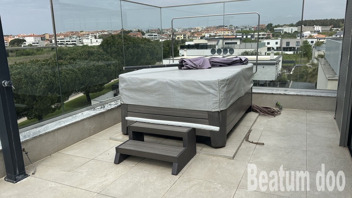 Appartamento al secondo piano, di 62 m2, con terrazza sul tetto di 32 m2, due posti auto di 25,00 m2 e un ripostiglio di 3 m2, vista mare dalla terrazza e dalla terrazza sul tetto, riscaldamento a pavimento, aria condizionata in ogni stanza, sul tetto si trovano un bagno, un ripostiglio, una jacuzzi, una doccia e un barbecue, con mobili.