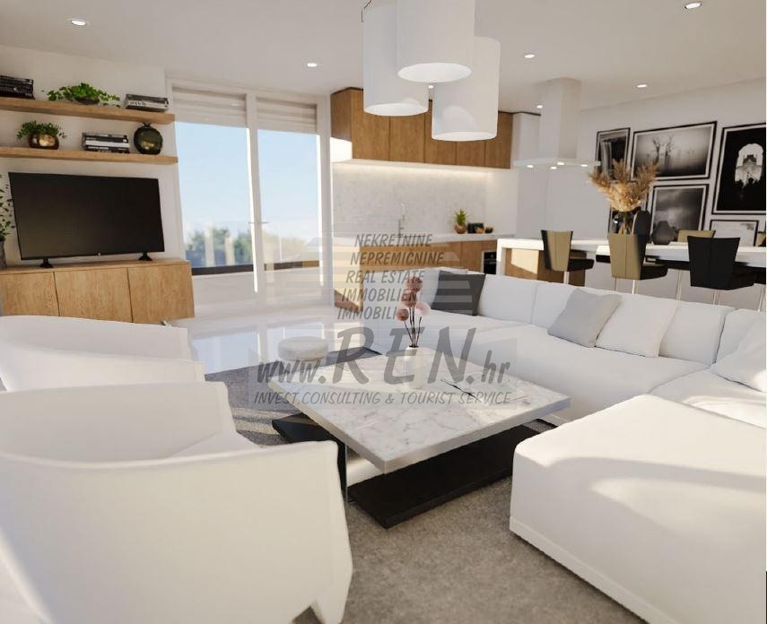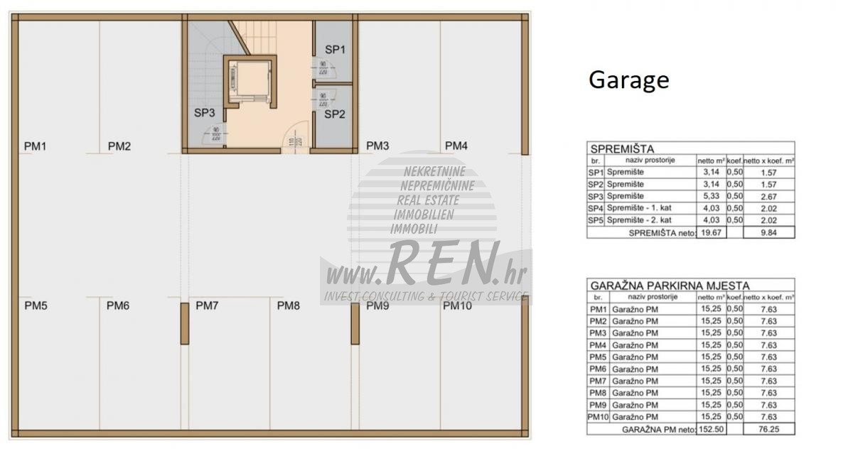 L'appartamento ha due posti auto nel garage sotterraneo e un ripostiglio, ci sarà un ascensore dal garage ai piani superiori. L'appartamento viene venduto chiavi in mano, senza mobili. Il completamento della costruzione è previsto per la fine del 2025.