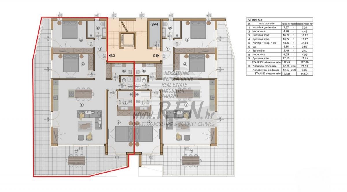 L'appartamento è composto da un corridoio con un guardaroba, un soggiorno aperto con cucina e zona pranzo, tre camere da letto, due bagni, un bagno per gli ospiti separato e un ripostiglio. Da ogni stanza c'è un'uscita diretta sull'ampia terrazza che è per lo più coperta.