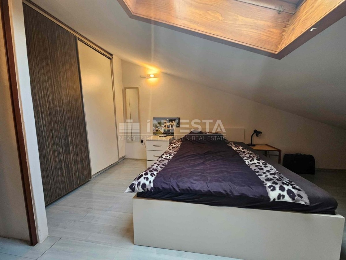 L’appartamento dispone di 126 m² di spazio sfruttato in modo intelligente. L’area giorno open space collega cucina, sala da pranzo e soggiorno in un insieme in cui la vita si raccoglie naturalmente – dal caffè del mattino sotto le finestre del tetto alle serate ammirando il tramonto. Le travi in legno a vista e lo stile mansardato conferiscono all’ambiente calore e carattere, raramente presenti nelle nuove costruzioni.