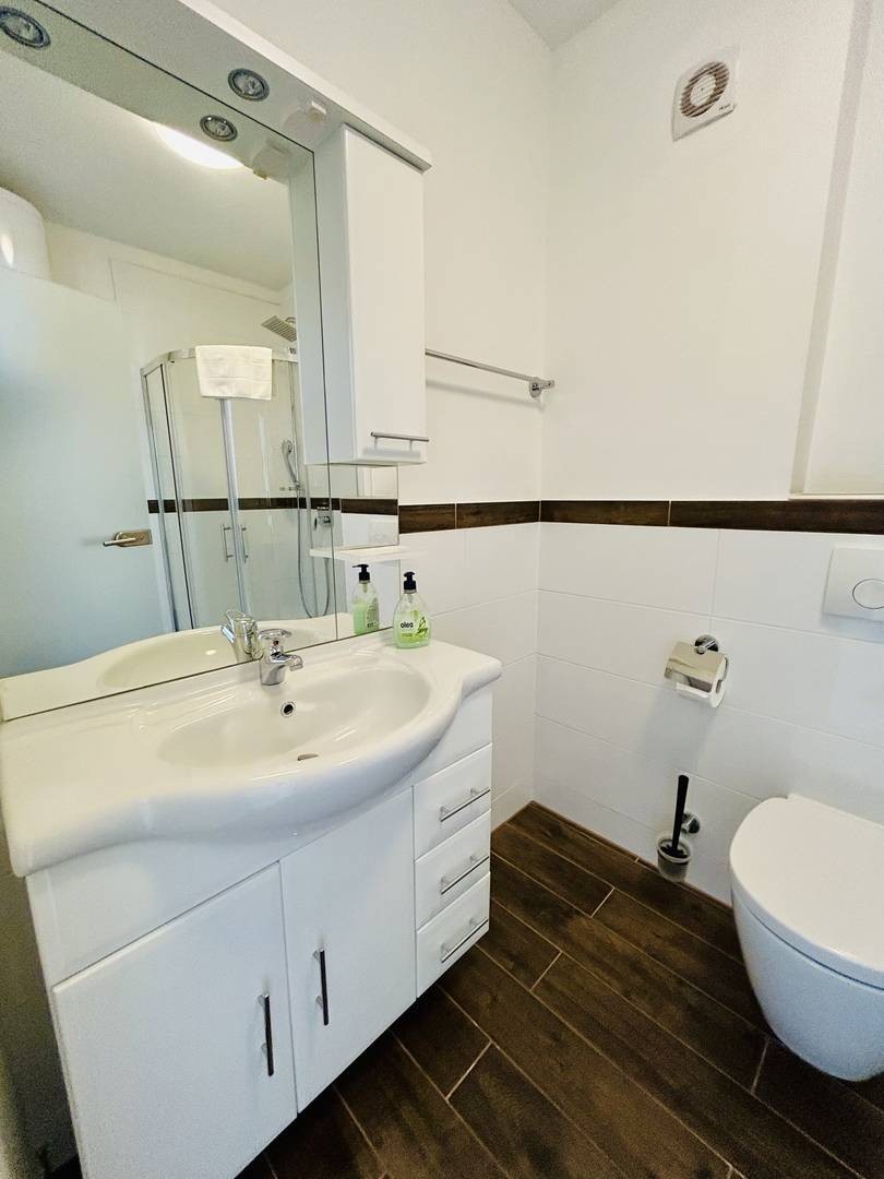 La superficie netta utile dell’appartamento è di 48,55 m2. L’orientamento sud-ovest garantisce abbondante luce naturale per tutto il giorno, evidenziando un’atmosfera molto luminosa negli ambienti. Dal soggiorno si accede al balcone/loggia spazioso, da cui si gode una bella vista sulla natura circostante.