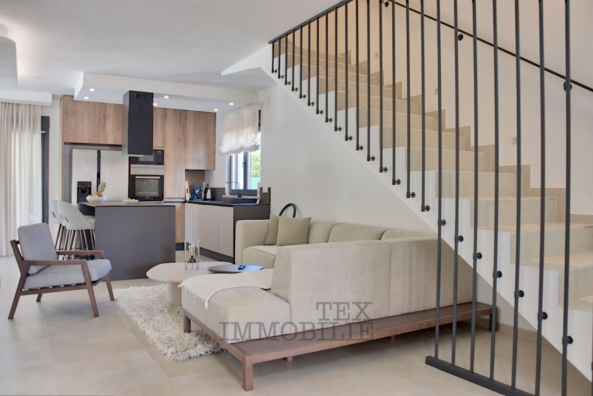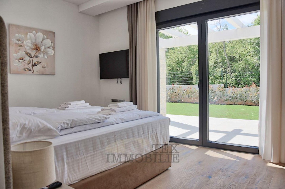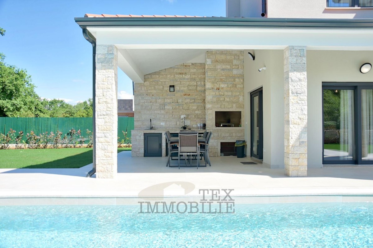Questa bellissima villa moderna si trova a Poreč, a soli 2 chilometri dal mare. La villa si sviluppa su due piani e la disposizione attentamente studiata offre uno spazioso ambiente abitativo di 218 metri quadrati. Al piano terra troverete una cucina, un soggiorno e zona pranzo, un bagno, un locale tecnico e una camera da letto con bagno. Al piano superiore, la villa dispone di tre camere da letto, ognuna con il proprio bagno privato. La camera matrimoniale presenta anche un terrazzo coperto di 17 metri quadrati. Per garantire comfort durante tutto l'anno, la villa è dotata di una pompa di calore e unità fan coil utilizzate per riscaldare e raffreddare tutte le stanze. Ci sono anche riscaldamenti a pavimento nei bagni e nel soggiorno. Lo spazio esterno include una spaziosa area piscina di 45 metri quadrati netti circondata da una zona prendisole, un'attraente area salotto all'aperto, un tavolo da pranzo coperto, una cucina estiva e un barbecue.