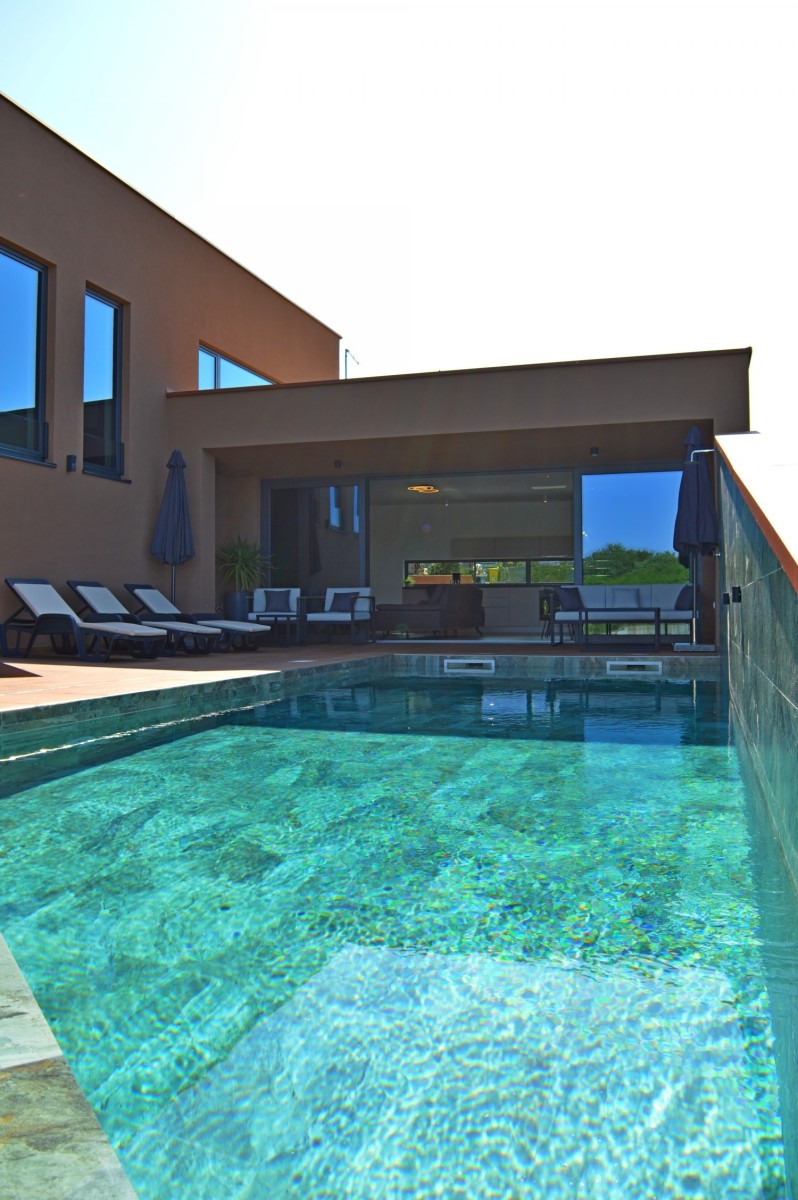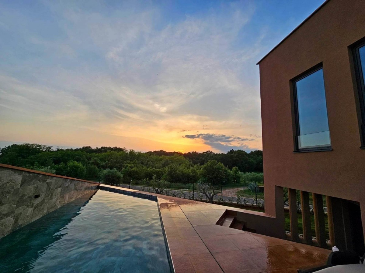 Villa di lusso dal design moderno con vista sul mare, vicino a Cittanova, a circa 2 km dalle spiagge, superficie abitabile totale di 142 m2 con giardino di 418 m2. Copre il seminterrato, il piano terra e il primo piano. Al piano terra troviamo un ingresso, un bagno e un'ampia zona giorno open-space di 45 mq, composta da una moderna cucina, una sala da pranzo e un soggiorno con pareti in vetro e uscita sulla terrazza dove c'è una piscina e un solarium con vista sul mare, sul paesaggio e sul verde. Al piano seminterrato si trova una camera padronale con bagno en-suite - una camera con bagno e uscita sul terrazzo, e un ripostiglio/lavanderia. Ci sono due camere da letto e un bagno al primo piano della casa. Vista mare dal primo piano e dal piano terra. Altre caratteristiche: aria condizionata integrata di alta qualità, riscaldamento a pavimento, piscina all'aperto, ampia terrazza, area grill, giardino, parcheggio privato.
