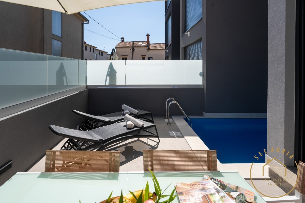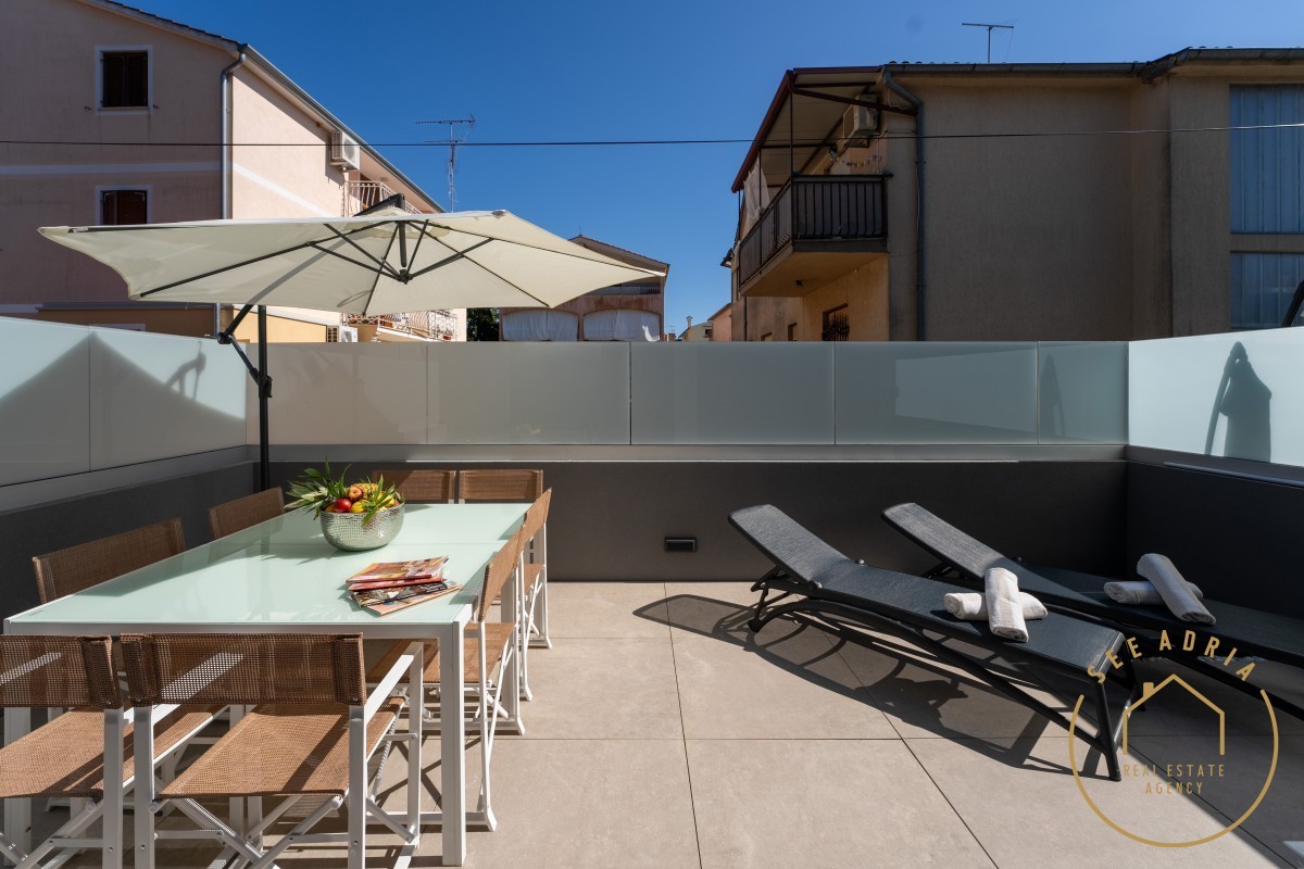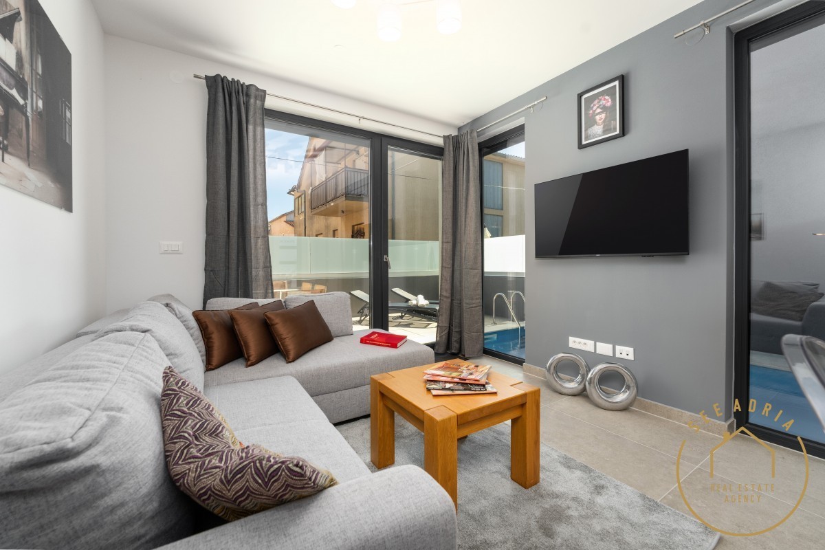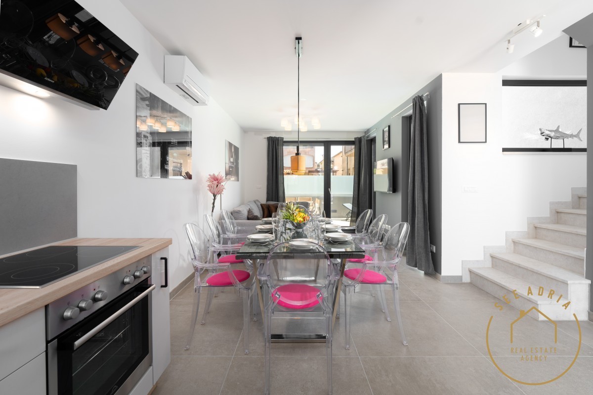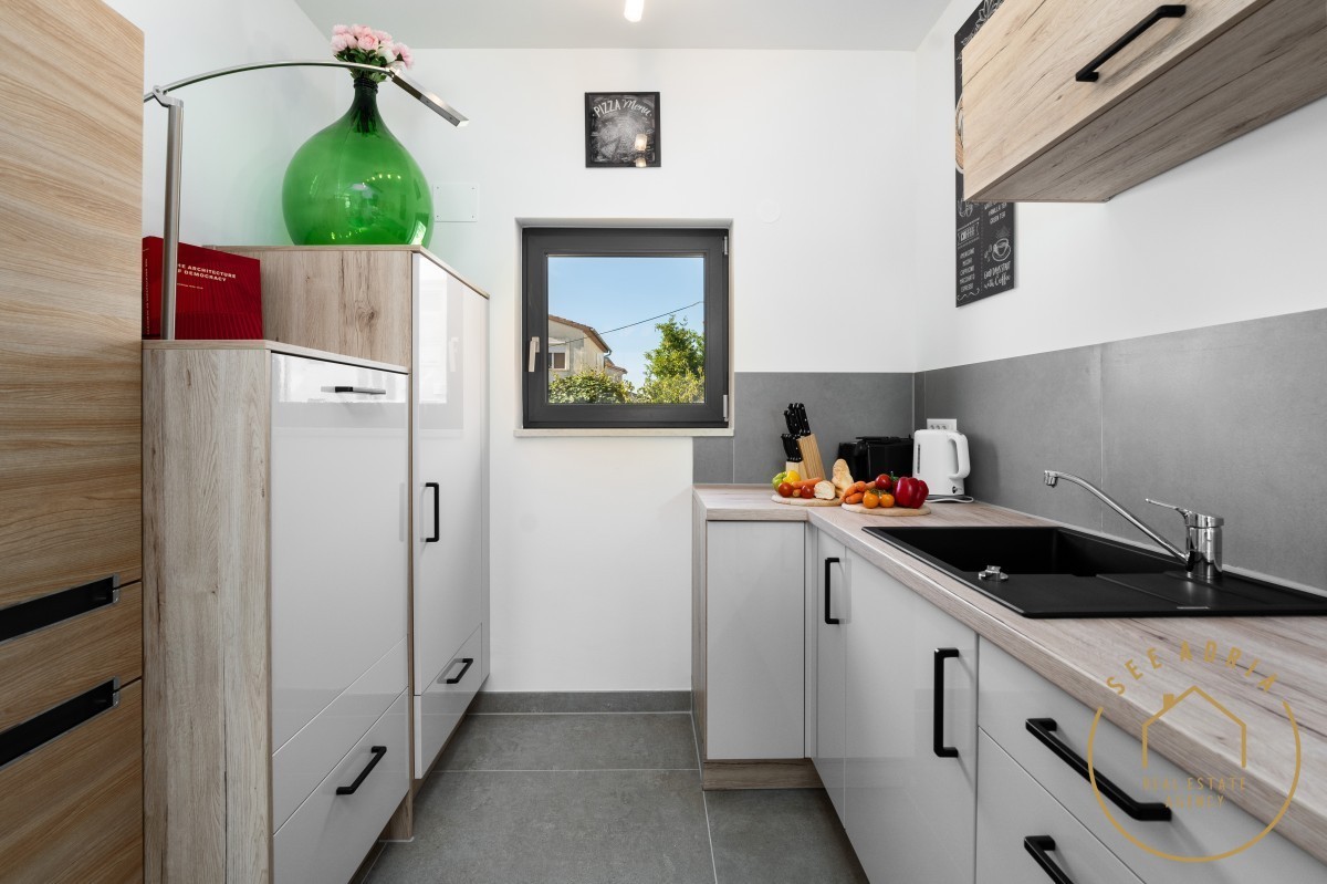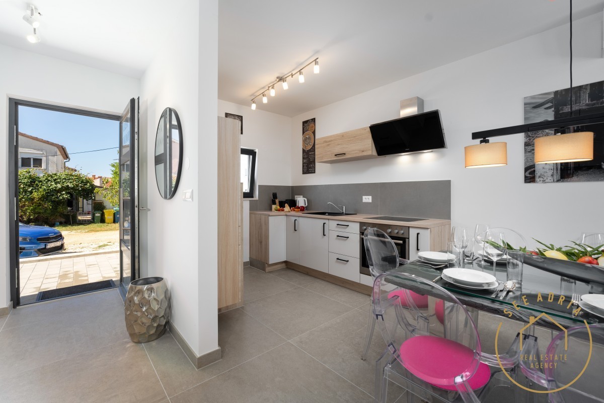 In vendita una casa a schiera con piscina privata. Si trova nel centro di Funtana, a solo un chilometro dalla spiaggia. Al piano terra si trovano la cucina, la sala da pranzo e il soggiorno con accesso a una terrazza privata con piscina. Al piano terra si trovano anche un ripostiglio e un bagno di servizio. Il primo piano è composto da due camere da letto con letti matrimoniali e un bagno. Anche il secondo piano ospita due camere da letto e un bagno. I piani sono collegati da una scala interna.