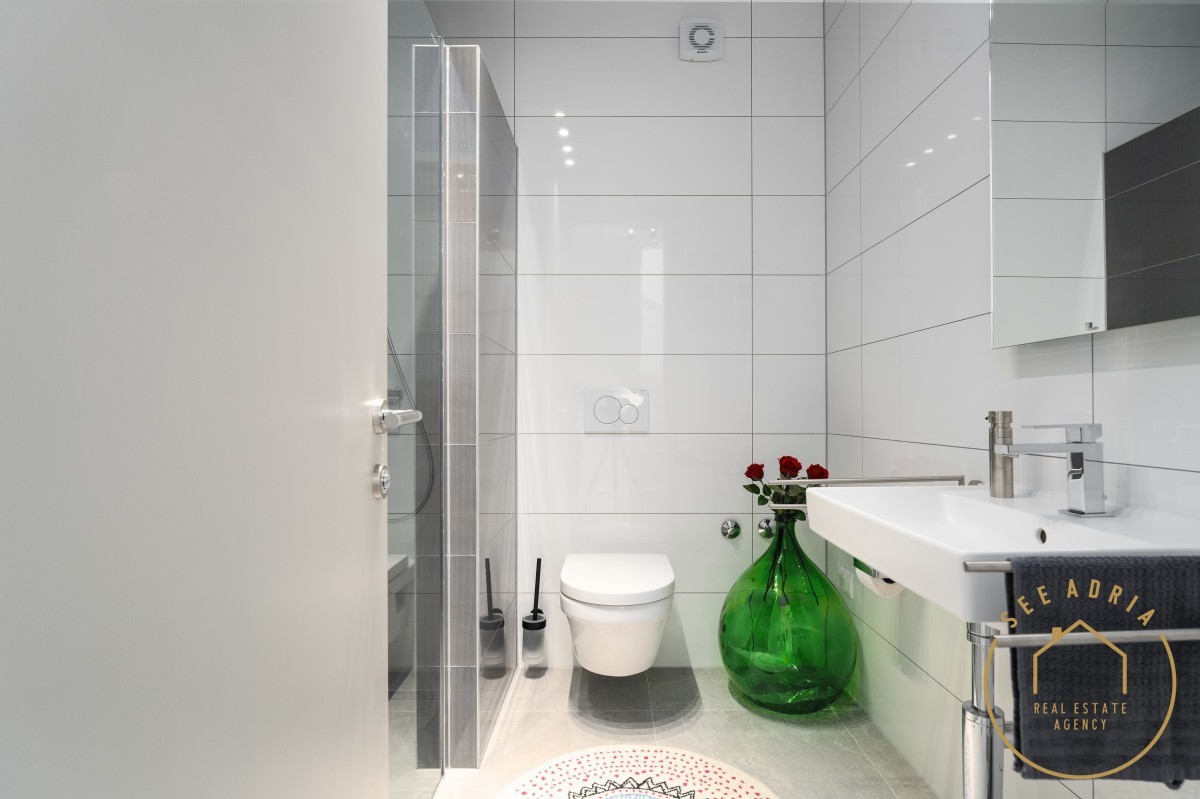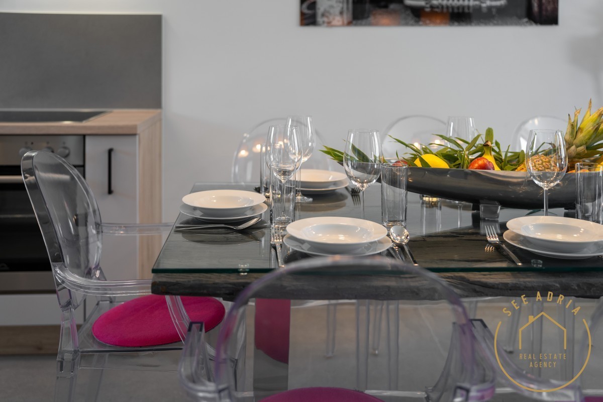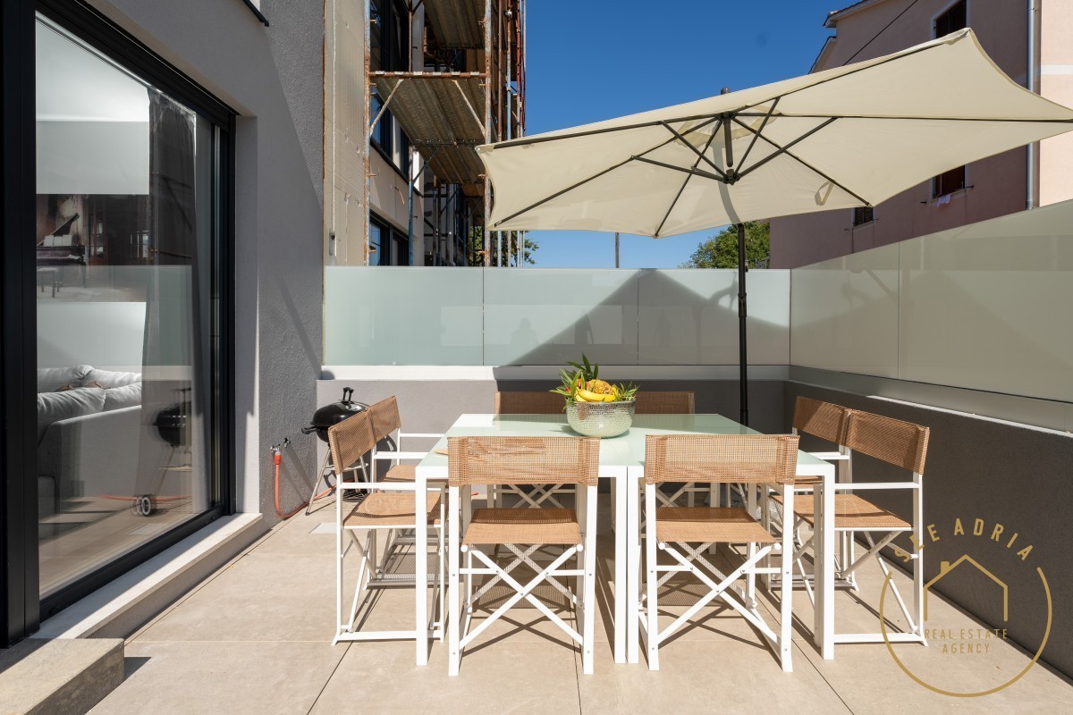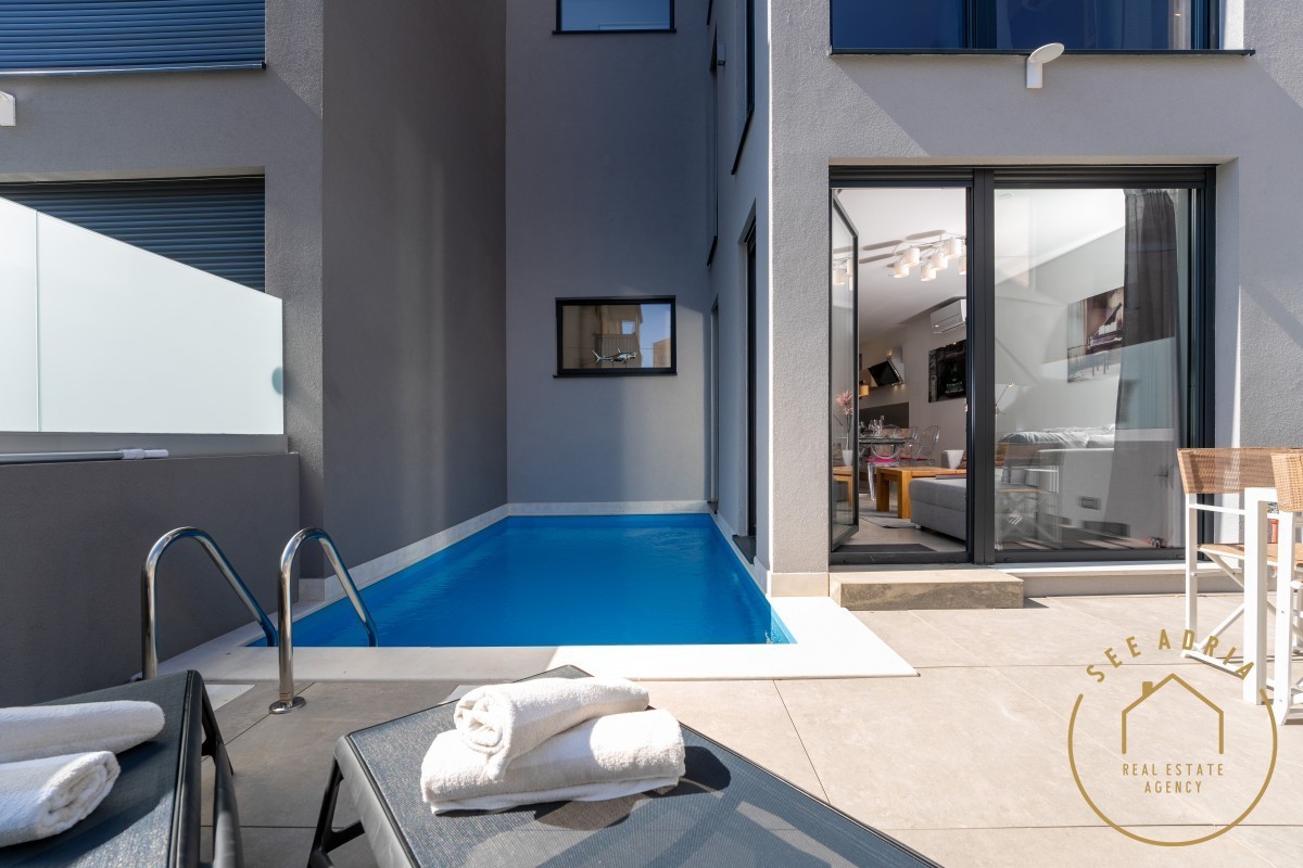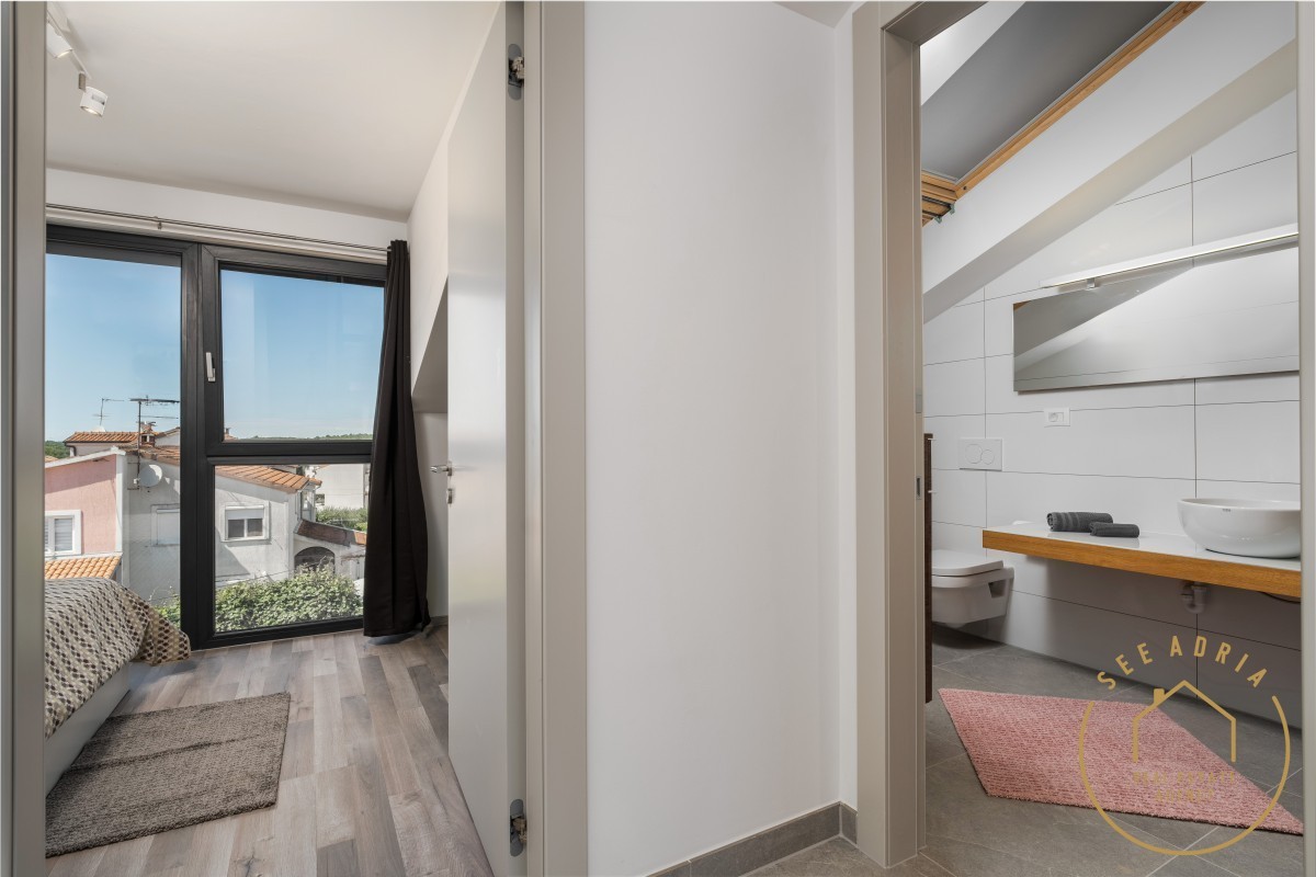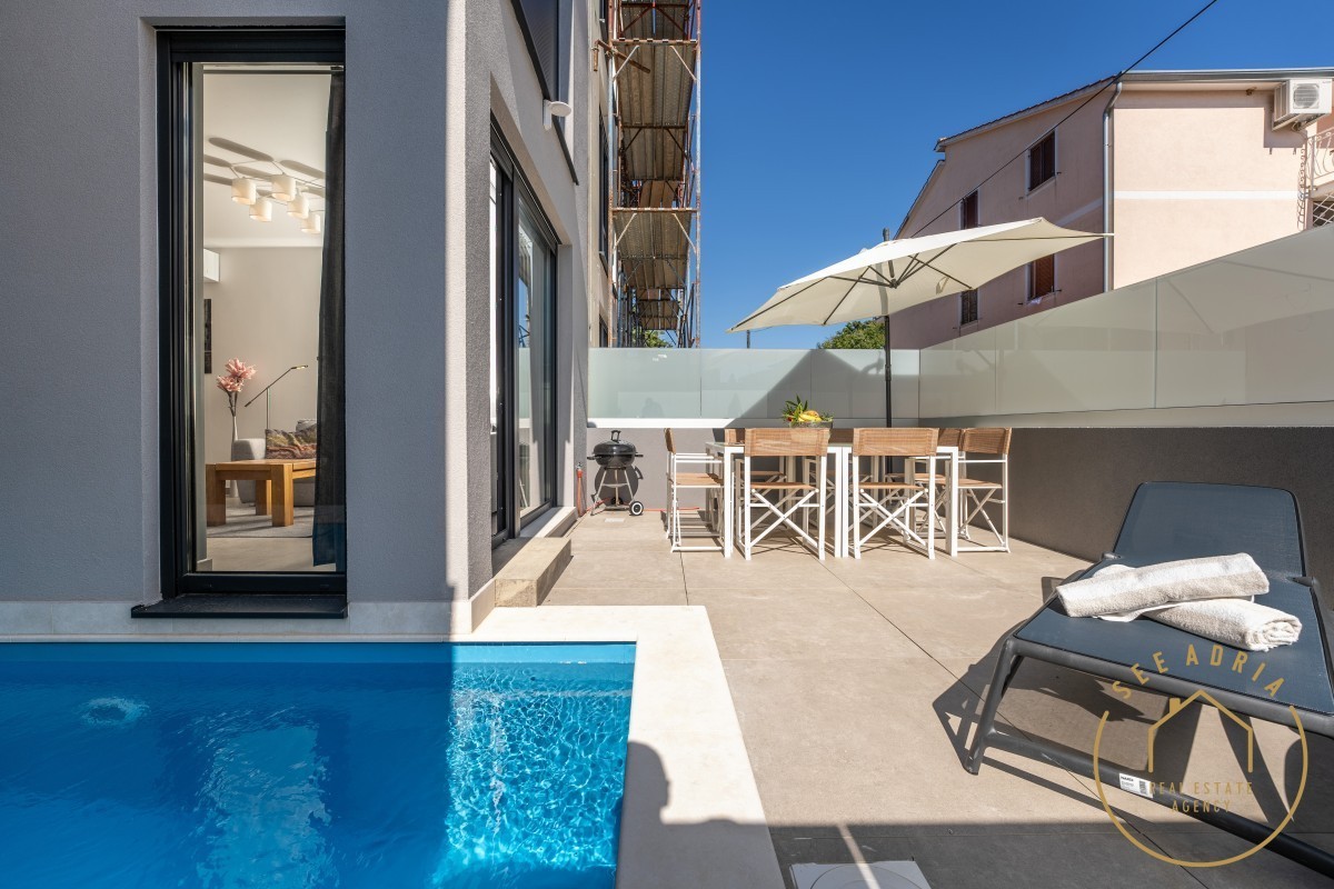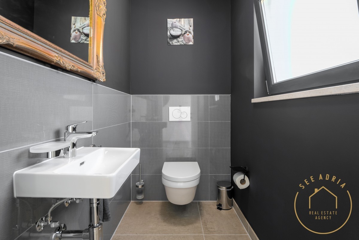 In vendita una casa a schiera con piscina privata. Si trova nel centro di Funtana, a solo un chilometro dalla spiaggia. Al piano terra si trovano la cucina, la sala da pranzo e il soggiorno con accesso a una terrazza privata con piscina. Al piano terra si trovano anche un ripostiglio e un bagno di servizio. Il primo piano è composto da due camere da letto con letti matrimoniali e un bagno. Anche il secondo piano ospita due camere da letto e un bagno. I piani sono collegati da una scala interna.