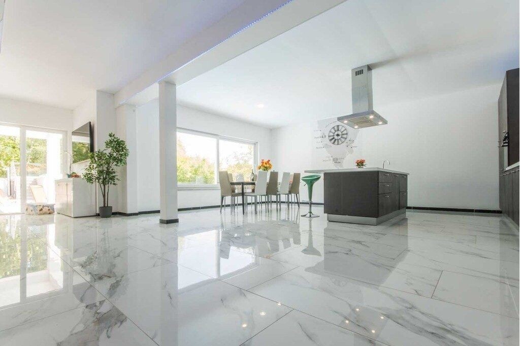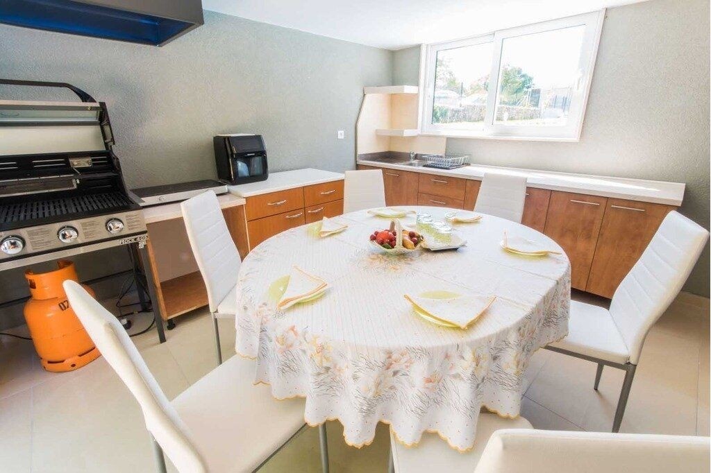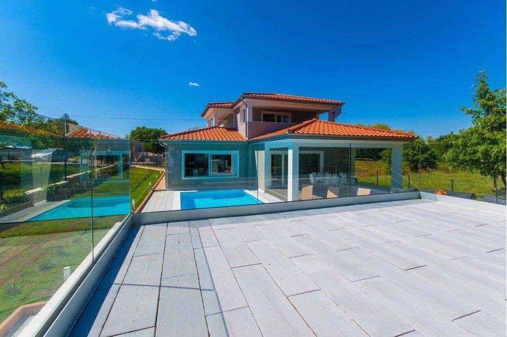 Dintorni di Labin - a circa 10 km dal mare - Bella casa moderna con una superficie totale di 270 m2 e si sviluppa su due piani. Il piano terra ha una cucina con zona pranzo, soggiorno, due camere da letto, due bagni, servizi igienici e una spaziosa terrazza coperta. Raggiungiamo il primo piano tramite scale, e ci sono altre due camere da letto, due bagni e due terrazzi coperti. La casa dispone di satellite e ogni camera ha il proprio televisore a LED. La proprietà dispone di un giardino recintato di 700 m2 con una grande piscina privata di acqua salata e una cucina estiva con grill a gas. Accanto alla piscina si trova un solarium con doccia esterna. La casa sul tetto ha anche pannelli solari. Posizione estremamente tranquilla e bella.