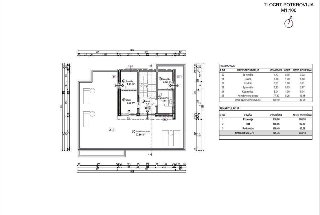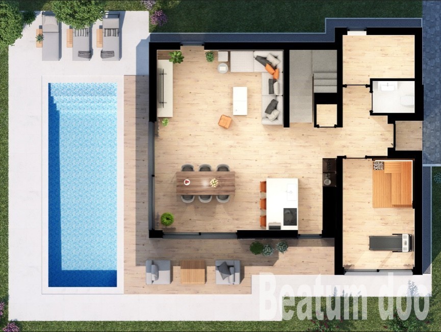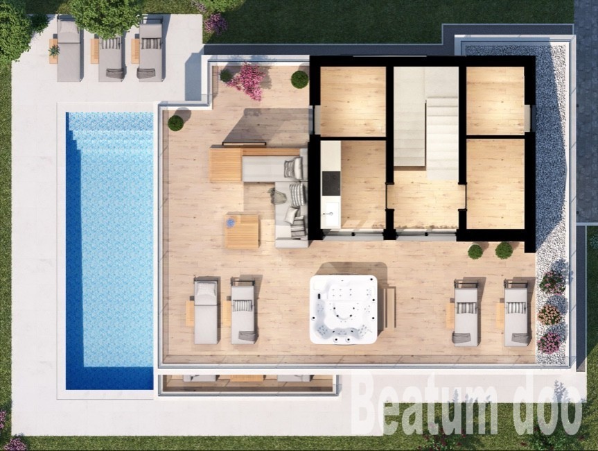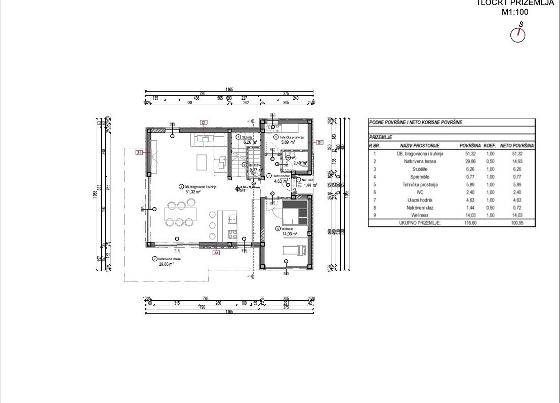 Piano terra: soggiorno, cucina, deposito, camera tecnica, bagno, wellness