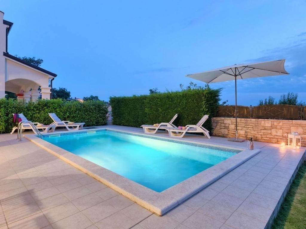 Nelle vicinanze di Parenzo, a circa 8 km dal mare, in un luogo con buone infrastrutture - vendesi casa vacanze indipendente con piscina di 130 m2 e vista sul mare - Piano terra: soggiorno con accesso alla terrazza coperta, cucina e sala da pranzo, bagno e ripostiglio - Piano: tre camere da letto, bagno e terrazza con vista sul mare. Riscaldamento: riscaldamento centralizzato a pellet. Terreno di 500 m2.