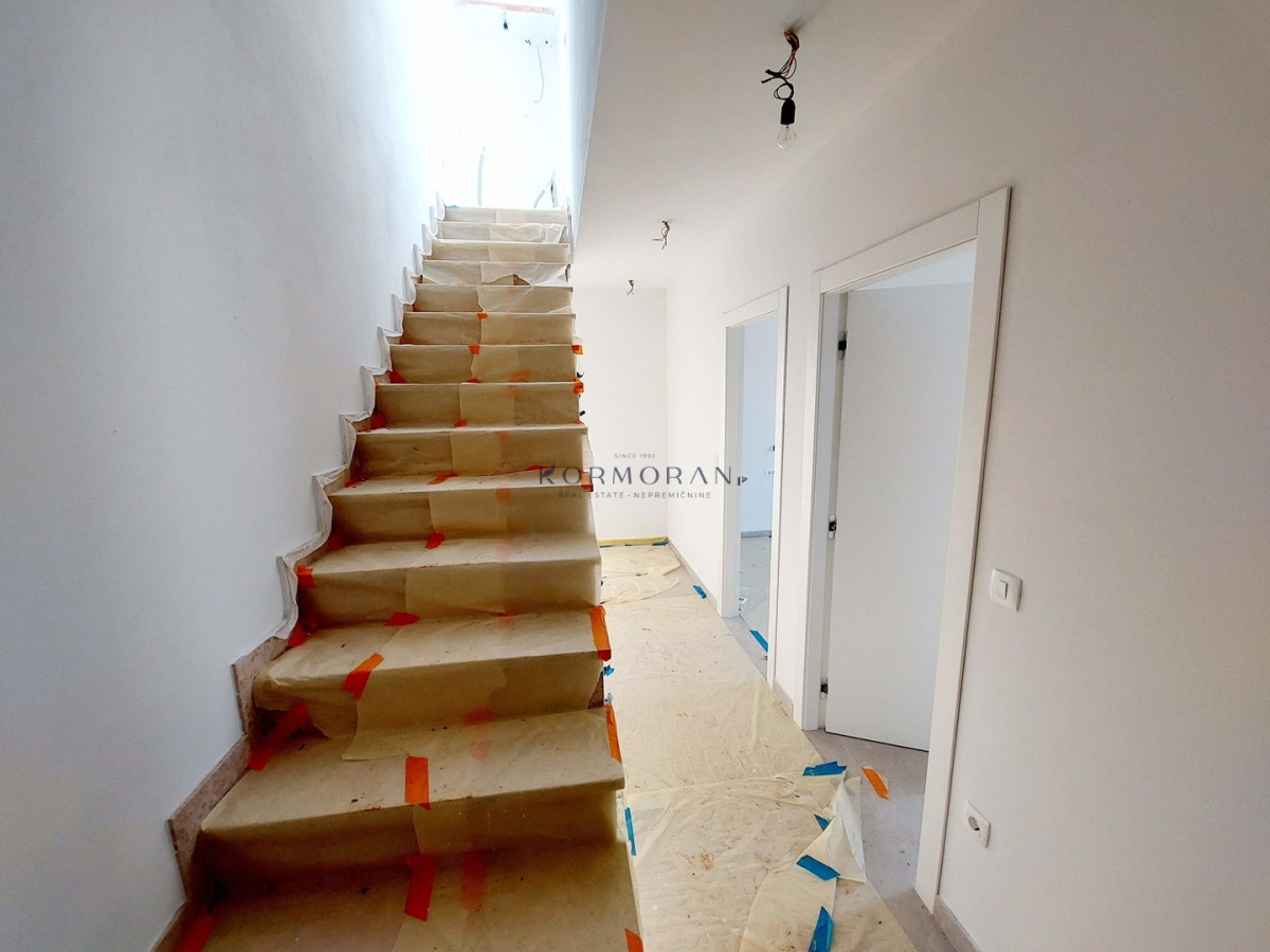 In vendita nuova casa a schiera, situata a Karigador, a soli 350 metri dal mare. La casa ha una superficie di 176,42 m2 distribuiti su tre piani: piano terra (63,57 m2) con ampio soggiorno e cucina, primo piano (61,79 m2) con tre camere da letto e bagno, e terrazza sul tetto (51,06 m2) con vista mare.