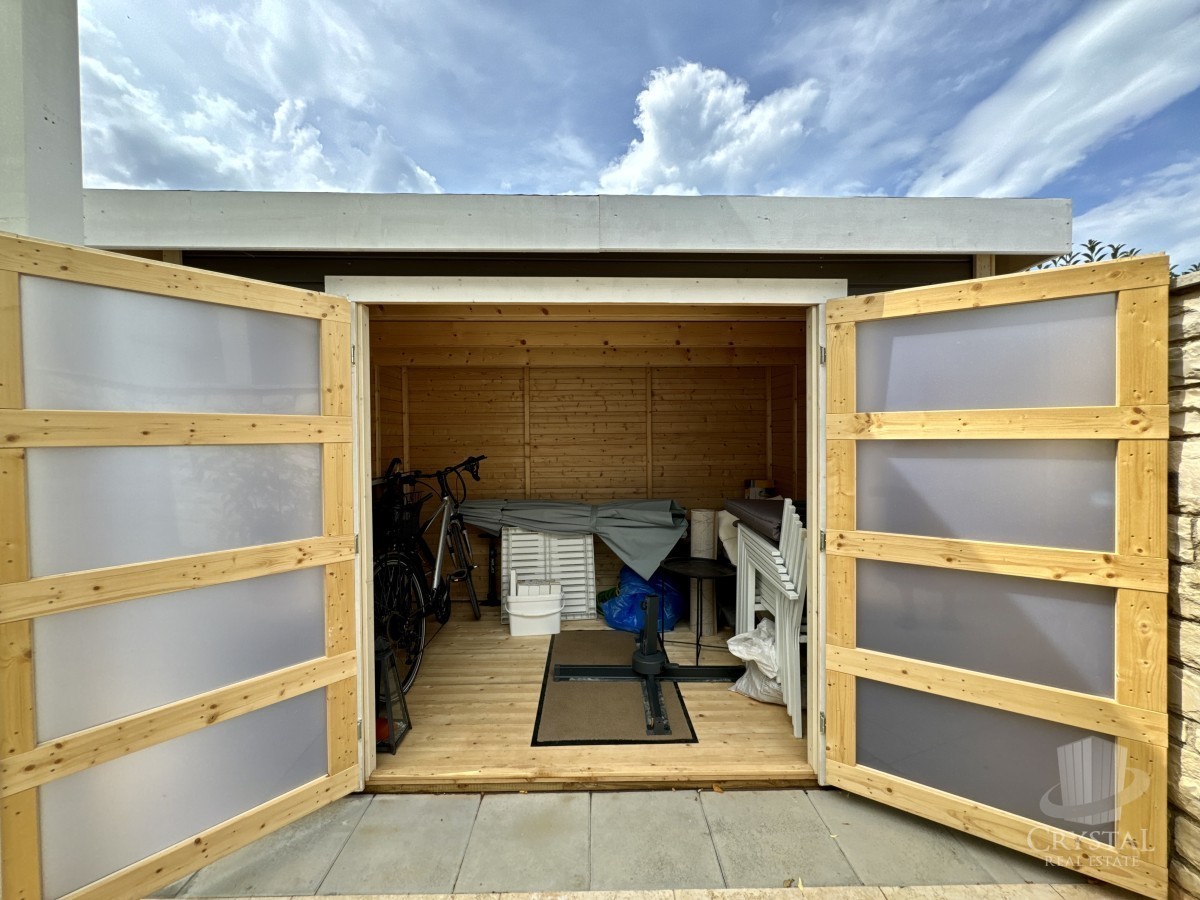 Il giardino di 290 m² è dotato di una piscina ed è ben curato e recintato. È presente anche un garage per riporre attrezzi, lettini e altri oggetti. Tutta la documentazione è in ordine e la proprietà è libera da vincoli. Questa casa è ideale sia per un'abitazione permanente che come investimentoi per scopi turistici.
