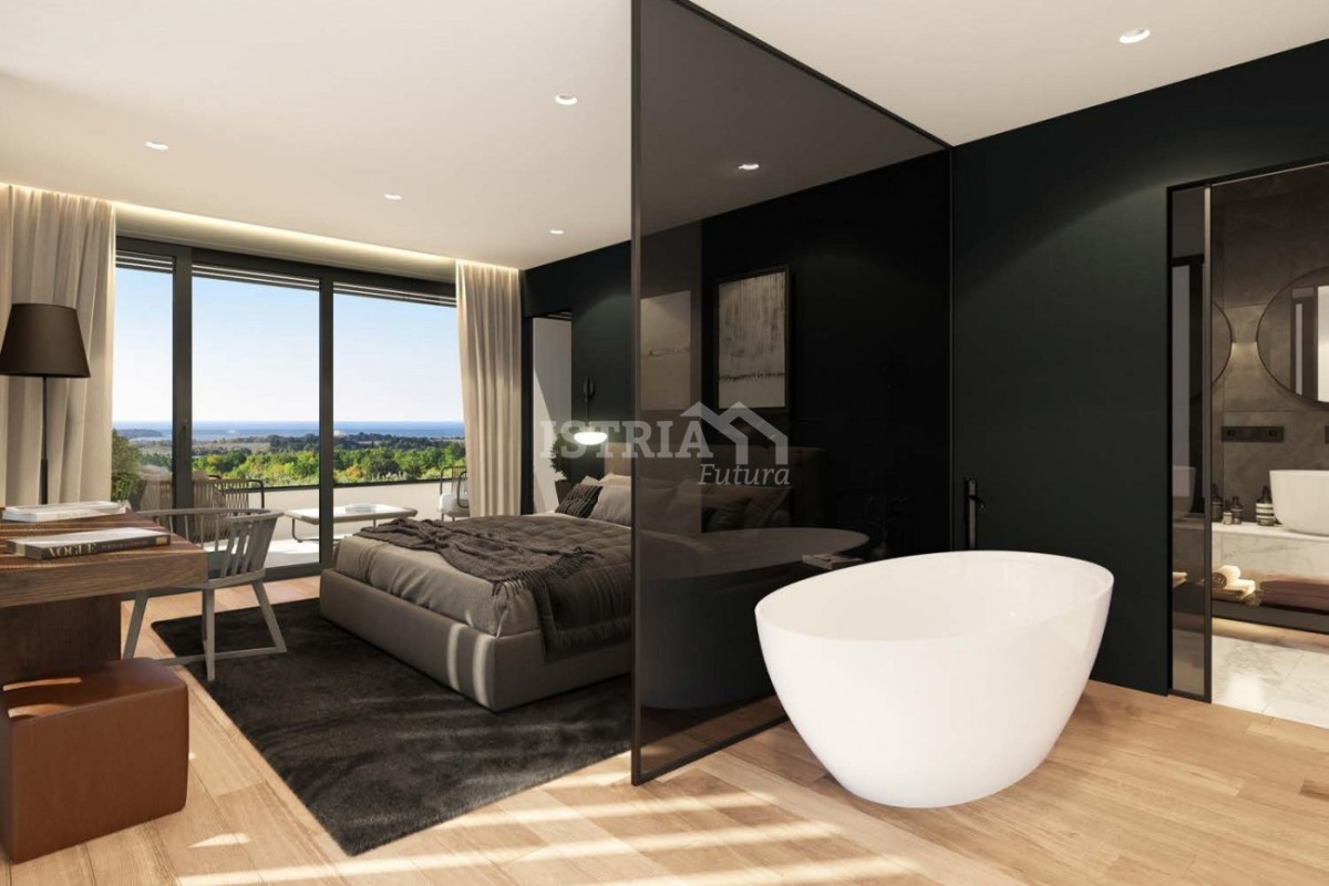 La camera padronale ha accesso ad un ampio terrazzo coperto con vista panoramica sul mare.