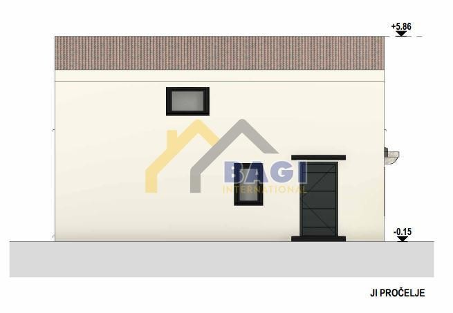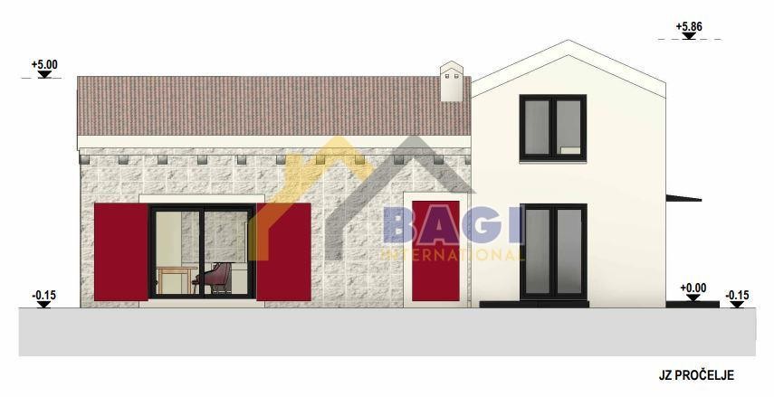 Il terreno di 614 m2 si trova alla fine di una tranquilla strada senza uscita ed è circondato su tre lati da muri a secco, che garantiscono ulteriore privacy e pace. La casa, con una superficie netta di 111 m2, è progettata come un edificio residenziale indipendente con un piano terra e un piano superiore e contiene edifici ausiliari come una piscina esterna con tutte le infrastrutture necessarie, una fossa di raccolta e due posti auto.