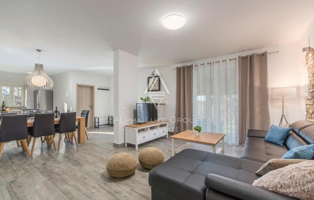 Scoprite una proprietà unica a Lovreč, in Istria, a soli 16 km da Poreč e 12 km da incantevoli spiagge. Questa villa, completamente ristrutturata nel 2020, offre 142m2 di elegante spazio abitativo, che unisce lusso moderno al fascino tradizionale istriano. Il piano terra dispone di un'ampia zona giorno con cucina integrata e spazio pranzo, un bagno e un ripostiglio. Salendo la scala interna, si trovano tre camere da letto al primo piano, tra cui una camera padronale con bagno privato, mentre le altre due condividono un bagno.