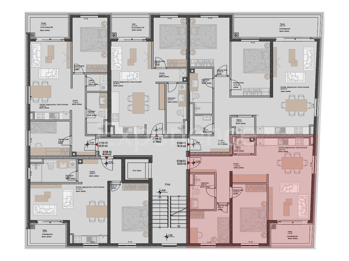 A Parenzo, nelle immediate vicinanze di tutti i servizi e a circa 1.300 m dalla spiaggia, è costruito un moderno edificio residenziale. Nelle immediate vicinanze si trovano negozi, asilo, scuola, ospedale, ristoranti e bar. La posizione dell'edificio è un'ottima scelta per la vita durante tutto l'anno, così come per chi vuole relax e pace nei mesi estivi. L'edificio è caratterizzato da una costruzione di alta qualità, un design moderno e spazi confortevoli che offrono un alto tenore di vita in una posizione unica vicino a tutti i servizi. In vendita è un appartamento con la superficie di 63,58 m². L'appartamento è situtao al terzo piano dell'edificio residenziale. Comprende: corridoio, uno spazio aperto e luminoso che unisce il soggiorno, sala da pranzo e cucina con accesso a terrazza coperta, due camere da letto, bagno e ripostiglio. Caratteristiche tecniche: - isolamento termico in lana di roccia da 12 cm, - ascensore, - riscaldamento a pavimento e acqua sanitaria tramite pompa di calore Daikin Altherma, - condizionatori Daikin in tutti le stanze, - serramenti in PVC con vetro isolante triplo (a tre strati), - zanzariere, - persiane in alluminio con comando elettrico, - eleganti porte interne con cerniere nascoste, - parquet nelle camere da letto, - porta d'ingresso antieffrazione. Il prezzo indicato non include un posto auto.Il prezzo del parcheggio dipende dalla tipologia: - posto auto in garage sotterraneo 15.000 €, - parcheggio coperto con presa di ricarica per veicoli elettrici 10.000 €, - parcheggio scoperto 5.000 €. Il completamento della costruzione è previsto entro il 1. luglio 2026. Notando, non si paga la tassa di trasferimento immobiliare per un importo di 3% dal prezzo di acquisto.