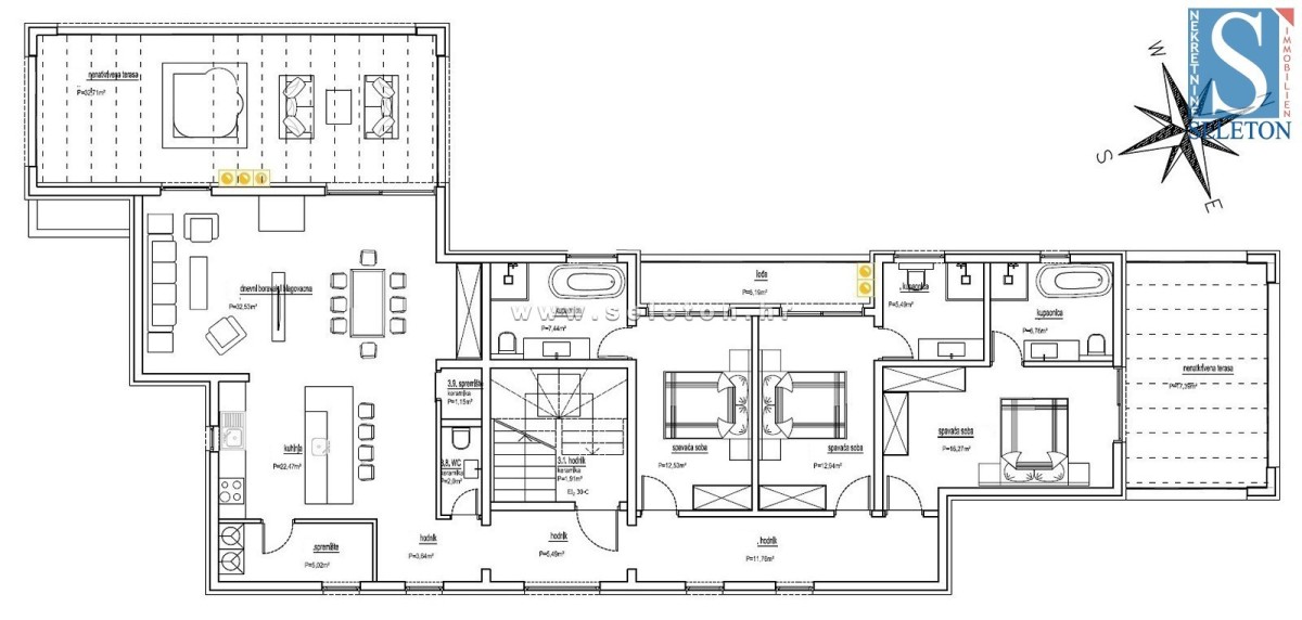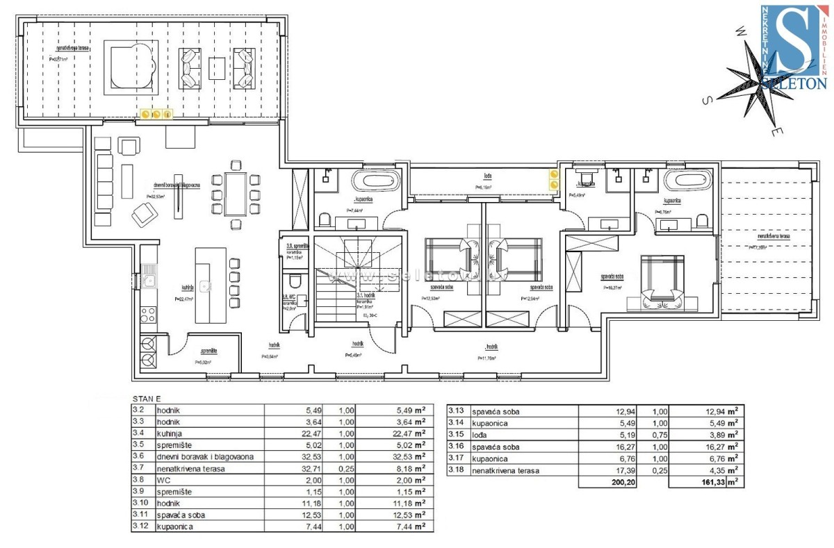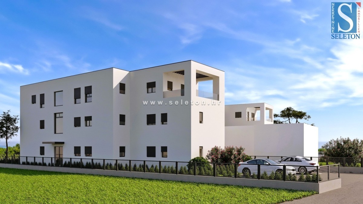 Poreč-Parenzo, in una zona urbana tranquilla, viene venduto un nuovo appartamento con una superficie di 161,54 m², composto da soggiorno, ampio terrazzo di 32 m² con vista sul mare, cucina, sala da pranzo, 2 ulteriori terrazze, disimpegno, 3 camere da letto - ciascuna con il proprio bagno e uscita sulla terrazza, dispensa e WC. L'appartamento si trova al secondo piano di una palazzina di complessive 5 unità abitative, è orientato verso sud, il che garantisce molta luce naturale. L'appartamento dispone di 4 condizionatori Mitsubishi Electric (nel soggiorno e nelle camere da letto), riscaldamento a pavimento in tutto l'appartamento (pompa di calore), acqua calda tramite pompa di calore con serbatoio da 175 litri, porta d'ingresso blindata, finestre in PVC a tre vetri, zanzariere e tapparelle elettriche, e due posti auto di fronte all'edificio. L'appartamento si trova in una strada senza uscita con poco traffico, a 500 m dalla stazione dei mezzi pubblici, a 1,5 km dal mare/spiaggia e a 3 km dal centro di Poreč-Parenzo.
