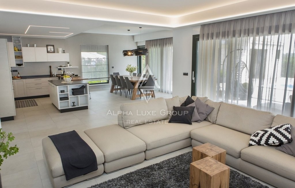 Il giardino paesaggistico, dotato di irrigazione automatica, include una piscina di 50 m², una jacuzzi, una casa barbecue con camino e una cucina estiva completamente attrezzata.