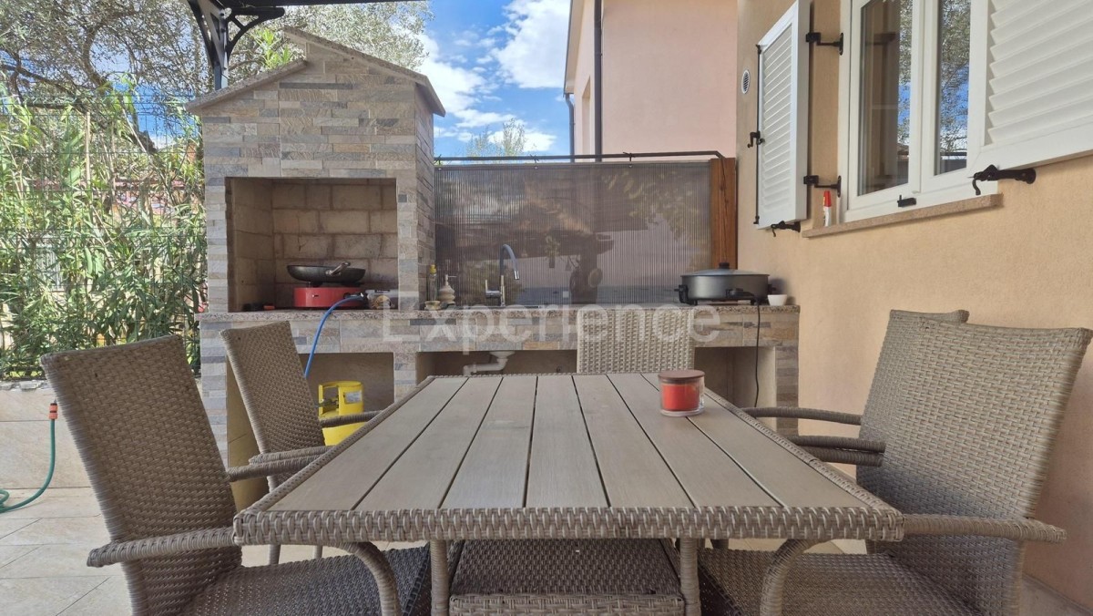 In un ambiente idilliaco e tranquillo nelle vicinanze di Parenzo, a soli 1.000 metri dal mare, è in vendita una casa bifamiliare con una superficie totale di 103 m². La casa si sviluppa su tre piani, progettata con cura per il massimo comfort e funzionalità. Gli interni sono progettati con particolare attenzione all'ariosità e alla luce naturale. Disposizione degli spazi: • Piano terra: corridoio, cucina e sala da pranzo con accesso a una spaziosa terrazza coperta, soggiorno e bagno, • Primo piano: due camere da letto, una delle quali con accesso al balcone e bagno, • Mansarda: spaziosa camera da letto con accesso alla terrazza. Per il riscaldamento e il raffreddamento, in tutte le stanze sono installati climatizzatori. Il giardino curato dispone di jacuzzi e cucina estiva. Il vantaggio speciale di questa casa è la POSIZIONE, a pochi passi si trovano la spiaggia, diversi ristoranti, un negozio di alimentari, supermercato e un bar.
