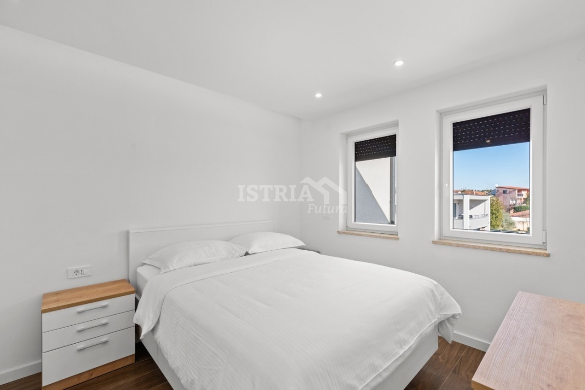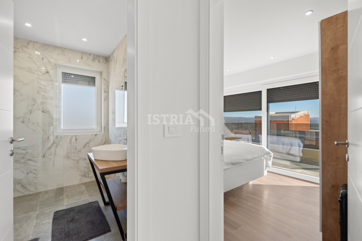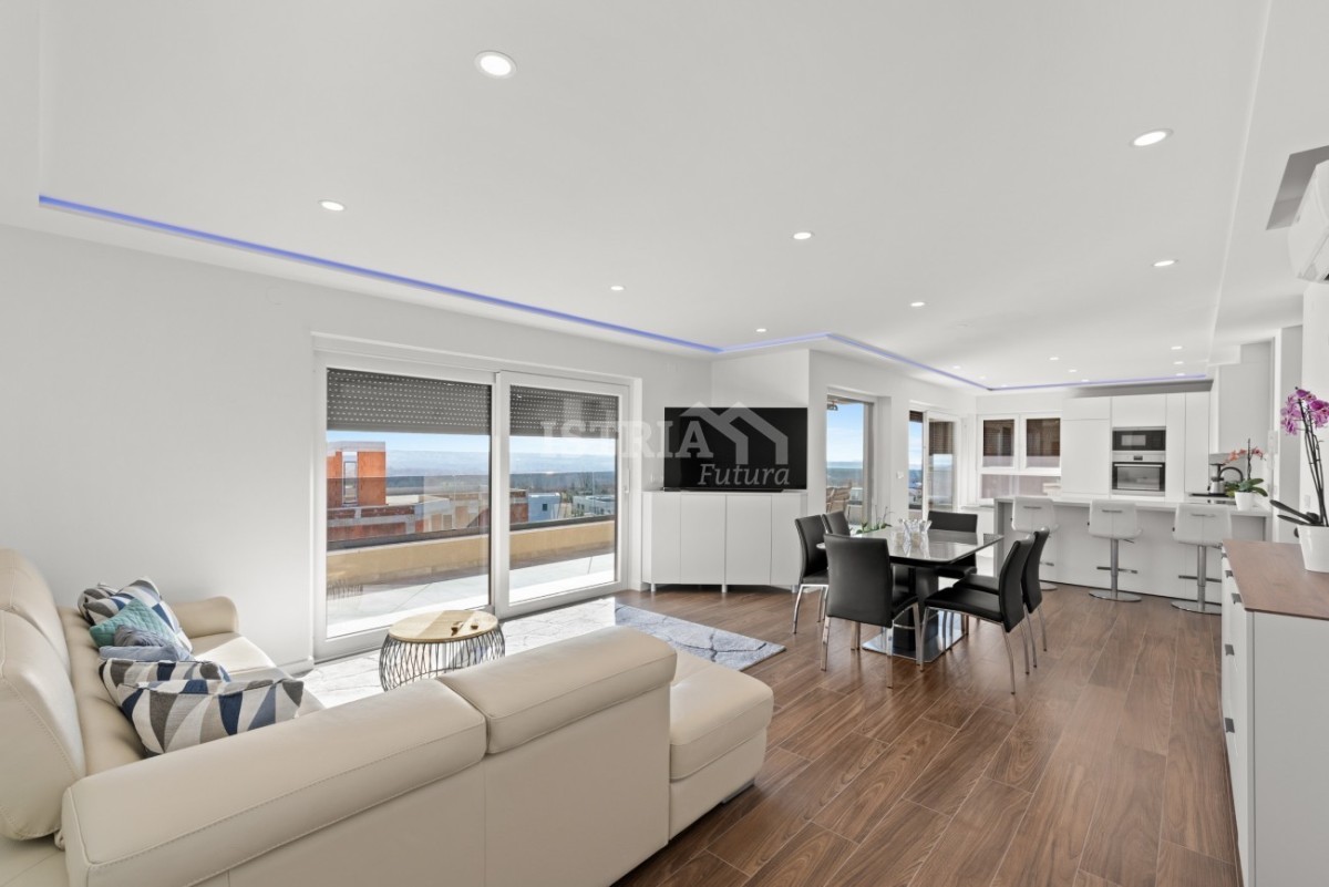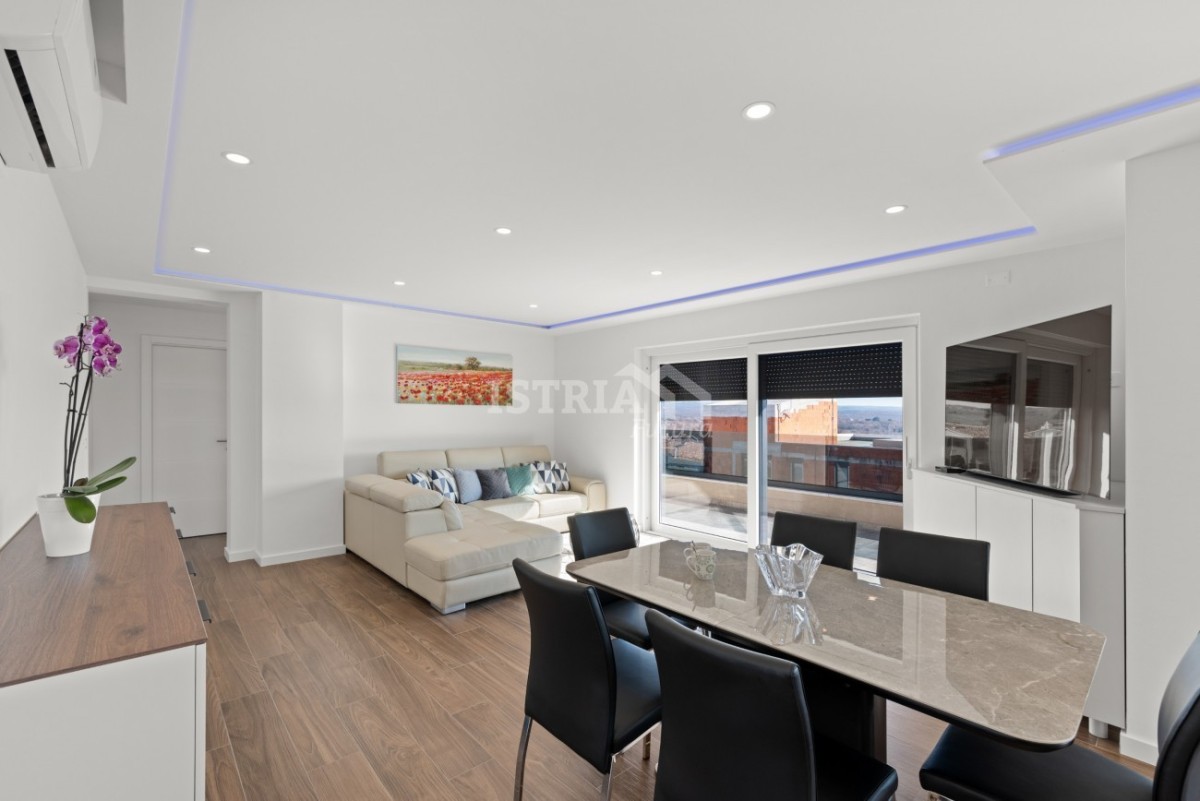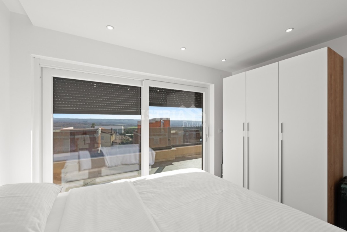 In vendita un lussuoso penthouse con una superficie netta di 122 m2 (brutto 151 m2), che occupa l'intero 2° piano di un piccolo edificio residenziale con soli 5 appartamenti, a soli 500 m dal centro di Tar, a 3 km dal mare e a 8,5 km da Parenzo e Cittanova.