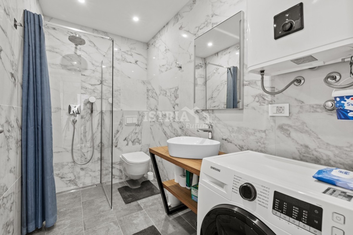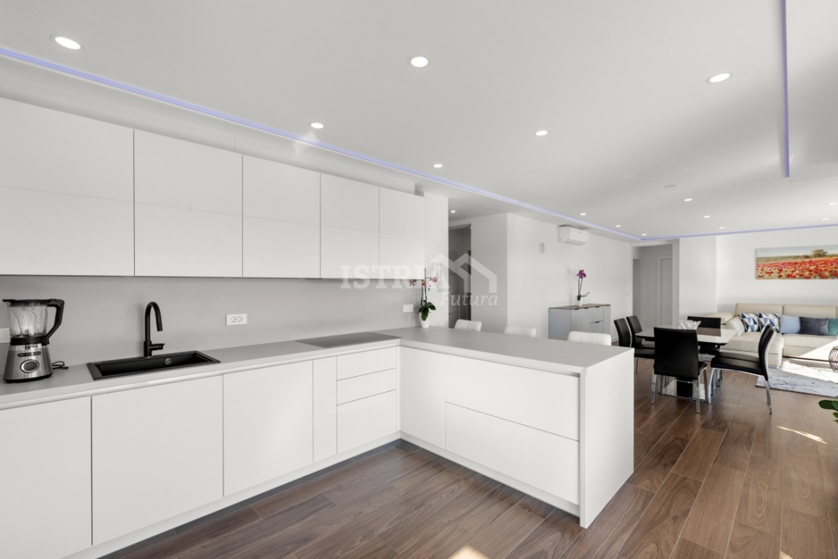 Per il massimo comfort durante tutto l'anno, l'appartamento è dotato di riscaldamento elettrico a pavimento e aria condizionata in tutte le stanze. Dispone inoltre di un collegamento alla canna fumaria che consente il riscaldamento a legna. L'appartamento è completamente arredato e dotato di mobili di prima classe e attrezzature di prima qualità. Sono stati installati infissi in PVC con tripli vetri e tutte le finestre e le pareti scorrevoli sono dotate di persiane elettriche. Ogni stanza è dotata di illuminazione indiretta, che crea un'atmosfera piacevole. L'appartamento comprende un ripostiglio nel seminterrato dell'edificio e due posti auto.