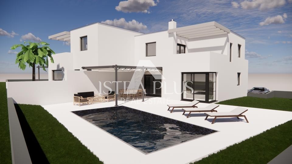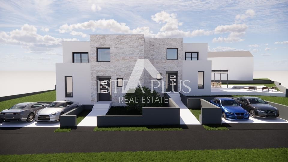 Casa bifamiliare in vendita ai margini di un tranquillo villaggio a 8 km da Parenzo. La costruzione dovrebbe iniziare alla fine del 2022 e essere completata nell'autunno del 2023.