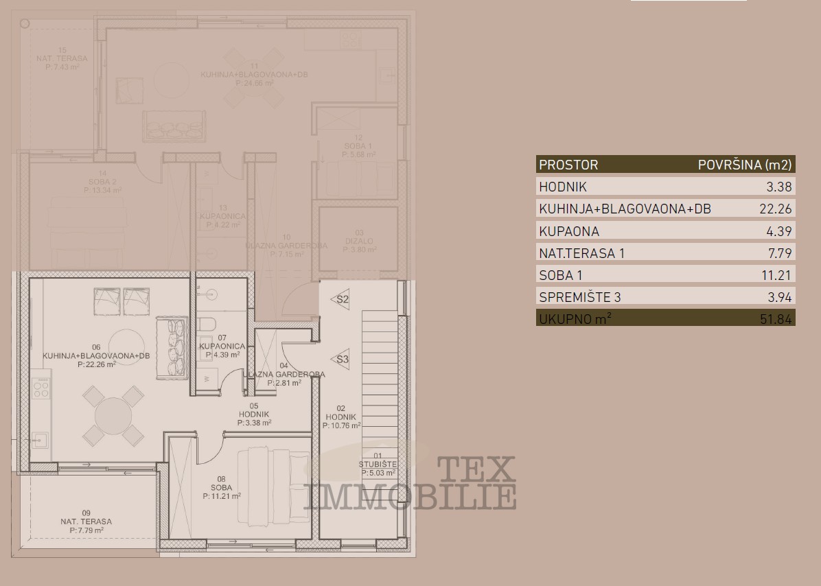In vendita moderno appartamento al primo piano di 51,8 m² con ripostiglio di 3,18 m² e due posti auto.