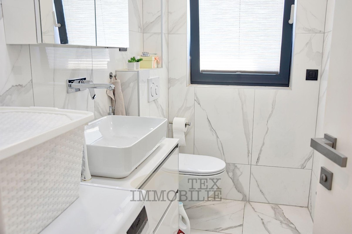 È in vendita un lussuoso appartamento a soli 10 minuti a piedi dal centro storico di Poreč e a soli 600 metri dalle spiagge più vicine. L'appartamento è composto da un ampio soggiorno, cucina e zona pranzo con accesso a una terrazza di 14 m², due camere da letto con bagno privato e un bagno per gli ospiti separato. Il riscaldamento è centralizzato a pavimento con gas di città. L'edificio è dotato di ascensore, finestre Schüco in alluminio con triplo vetro e l'appartamento comprende un ripostiglio e un posto auto.