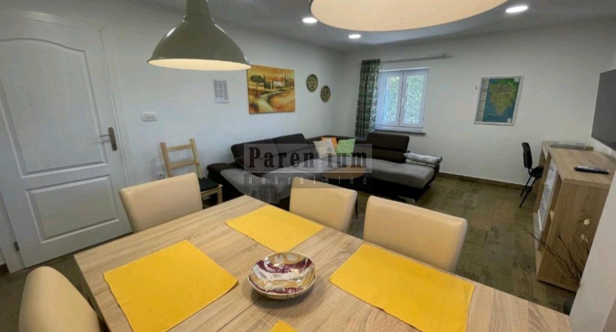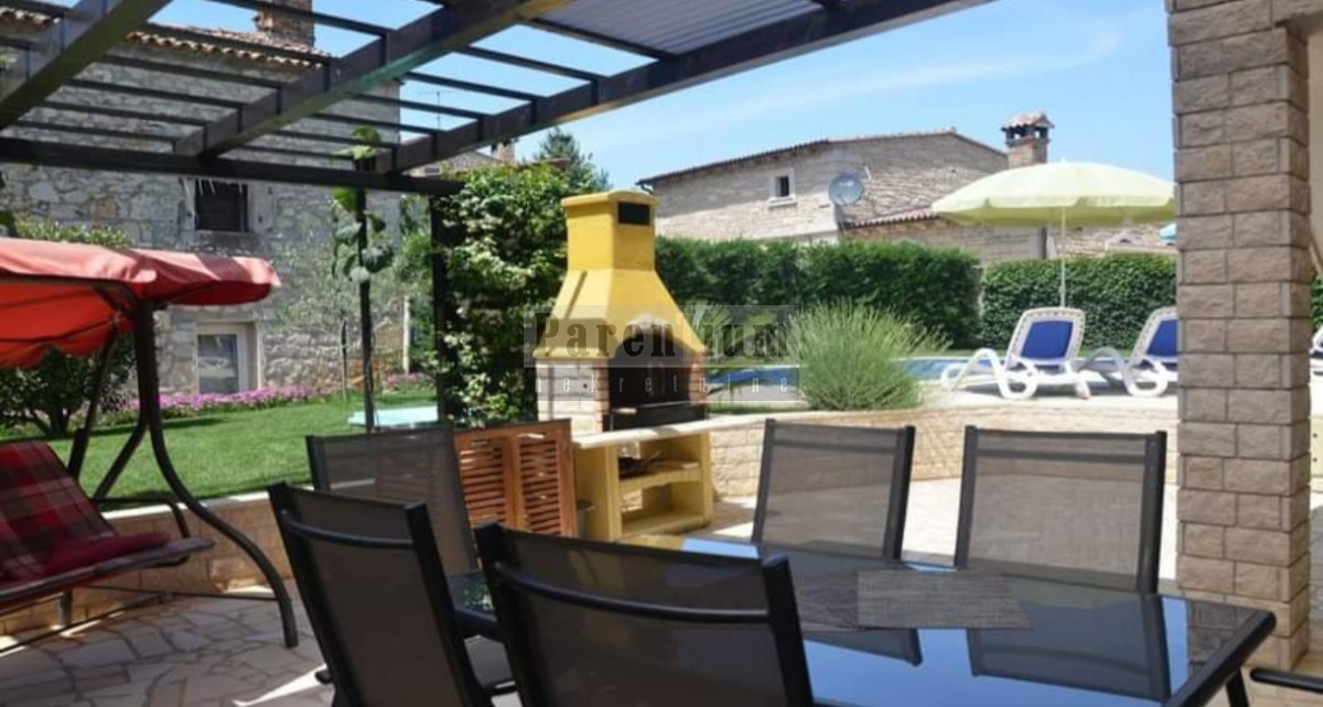 Parenzo, a soli 5 km dal centro della città e dal mare, questa casa indipendente in pietra è in vendita. Ha una superficie di 165m2 e si trova su un terreno di 396m2. Al piano terra c'è un ampio soggiorno, sala da pranzo, cucina, una camera da letto e bagno. Una scala esterna conduce al primo piano dove ci sono altre tre camere da letto e due bagni, una grande terrazza coperta.