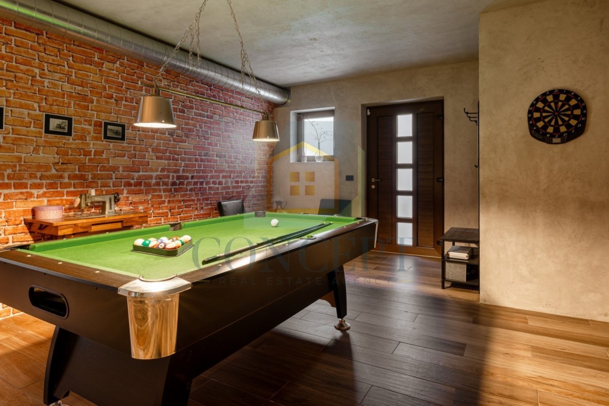 Nel seminterrato si trovano un corridoio, uno studio, due ripostigli, una stanza tecnica, un bagno per gli ospiti, una camera da letto, una cantina e una cucina aggiuntiva.