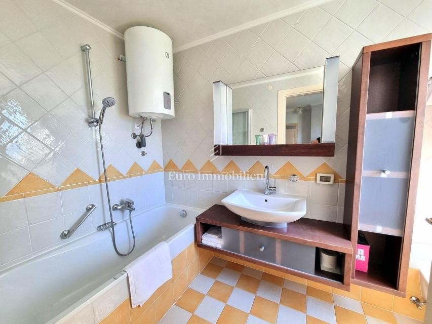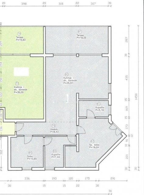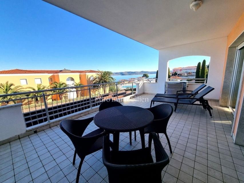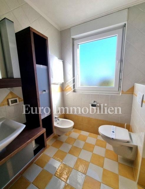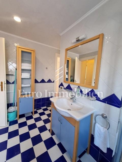 This beautiful apartment is located only 130 m from the sea, in a well-maintained part of the settlement. The building was built in 2005 and is regularly maintained. It is located on the high ground floor of a building with an elevator. It consists of a hallway, a living room-kitchen with an area of 35.51 m2, a terrace with an area of 24.47 m2, two bathrooms ans two bedrooms. The apartment also has a storage room in the basement of the building with an area of 10.59 m2. The total area of the apartment is 121.52 m2. The apartment is sold fully furnished, and heating and cooling are regulated by air conditioners.