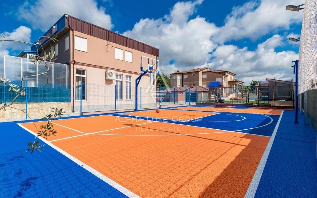 L'ampio giardino offre ampio parcheggio per sei-sette veicoli, una spaziosa piscina, una cucina estiva, un parco giochi per bambini e un campo sportivo multifunzionale, rendendo questa casa l'ambiente ideale per la vita familiare e il relax attivo.