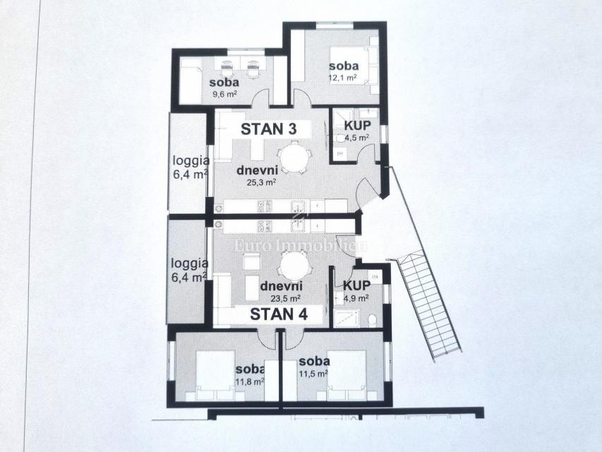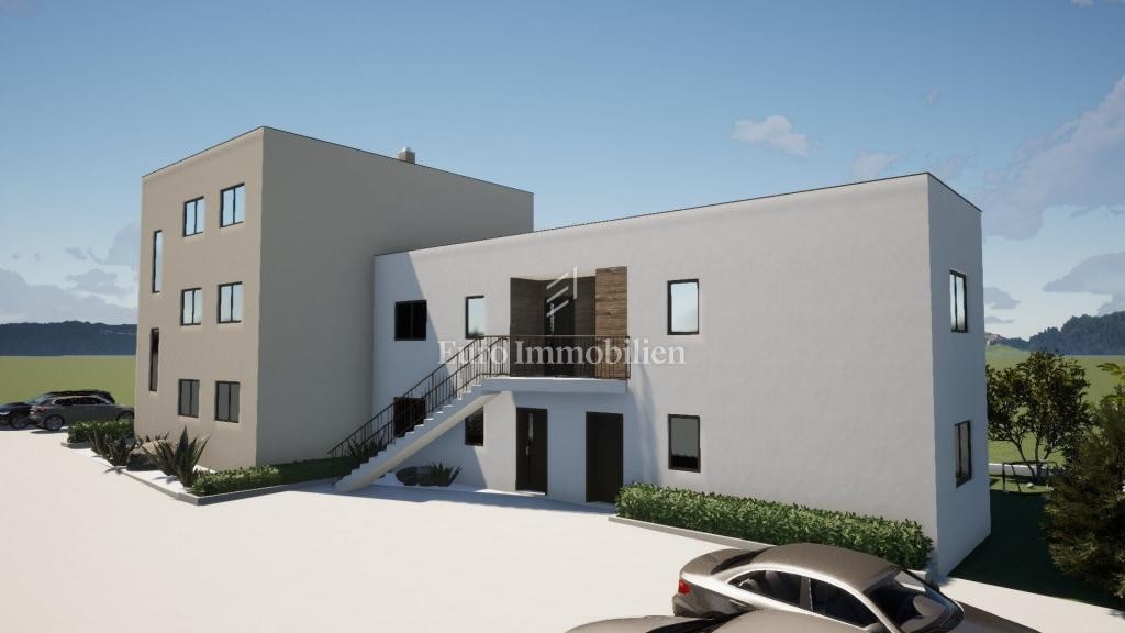 Apartment 4 is located on the 1st floor and consists of an entrance hall, two bedrooms, bathroom, living room, kitchen, dining room and a 6.40 m2 loggia. The apartments will be completed up to the furnishing phase, including quality ceramics and sanitary ware, electric underfloor heating, air conditioning, and interior wooden and exterior PVC joinery. Each apartment has 2 parking spaces. The expected completion of construction is the end of 2026. The buyer is exempt from paying real estate tax!