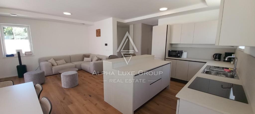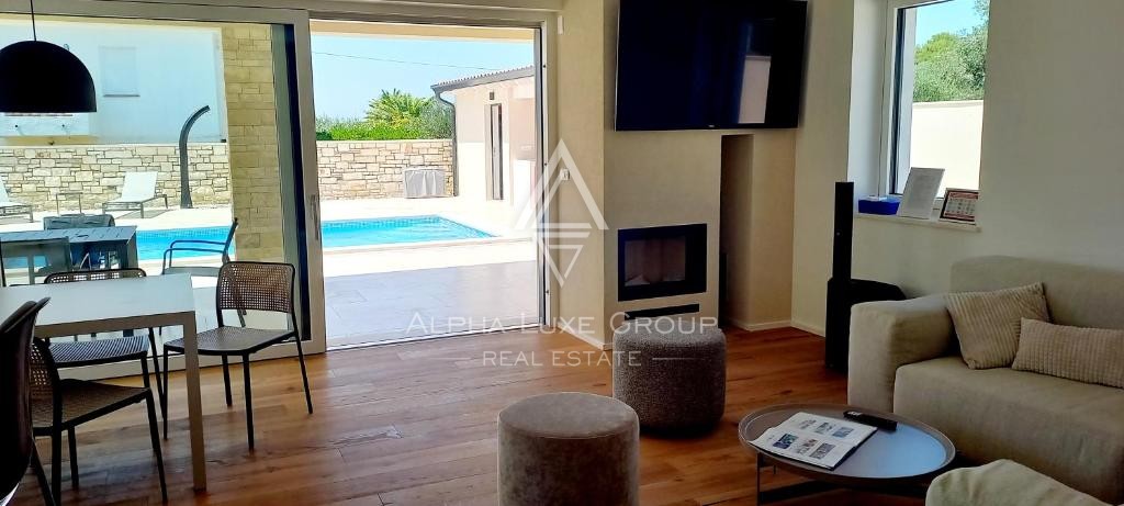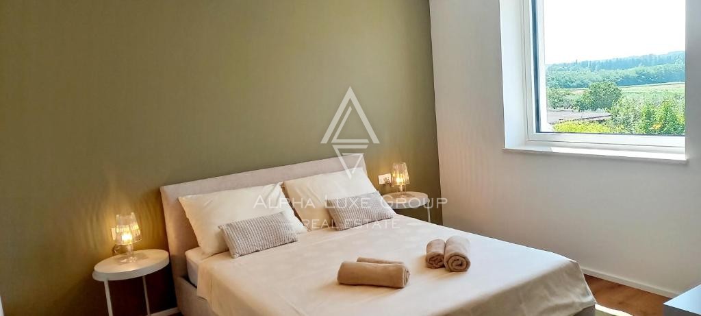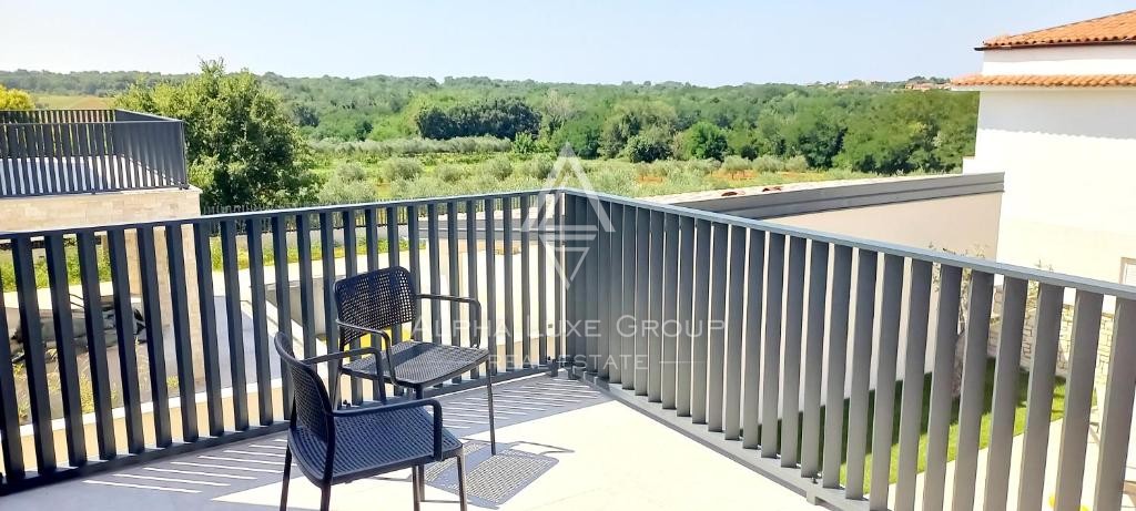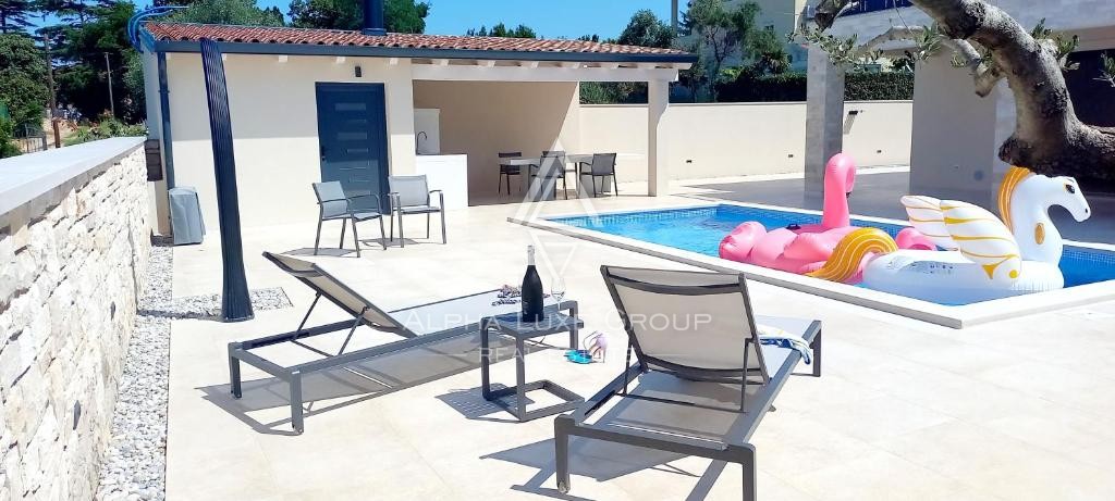 Questa moderna casa vacanze con piscina e splendida vista sul mare si trova in una zona tranquilla vicino a Umago. La proprietà dispone di un layout spazioso, distribuito su un seminterrato, piano terra, primo piano e terrazza sul tetto. L'area residenziale copre 193,55 m², mentre il seminterrato aggiunge ulteriori 27,68 m² di spazio.