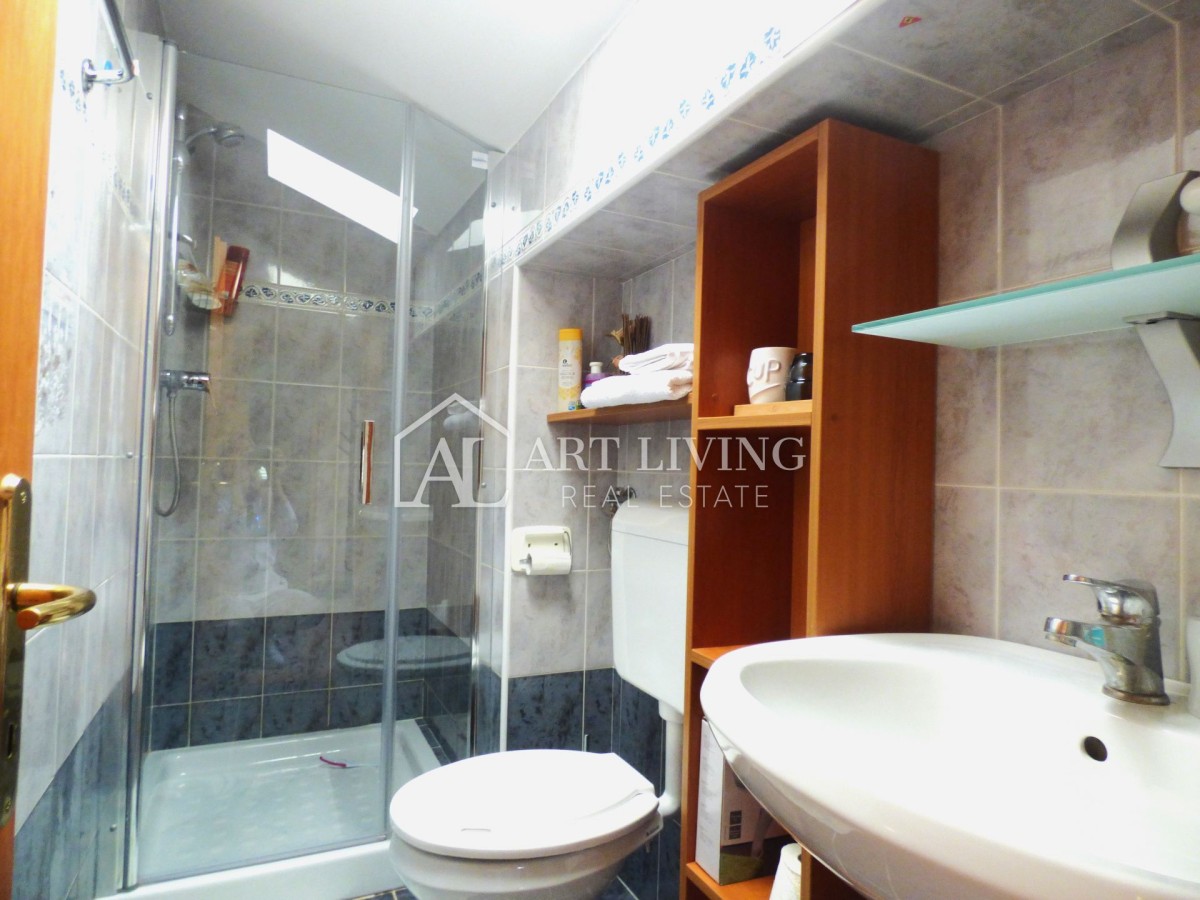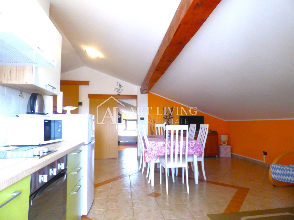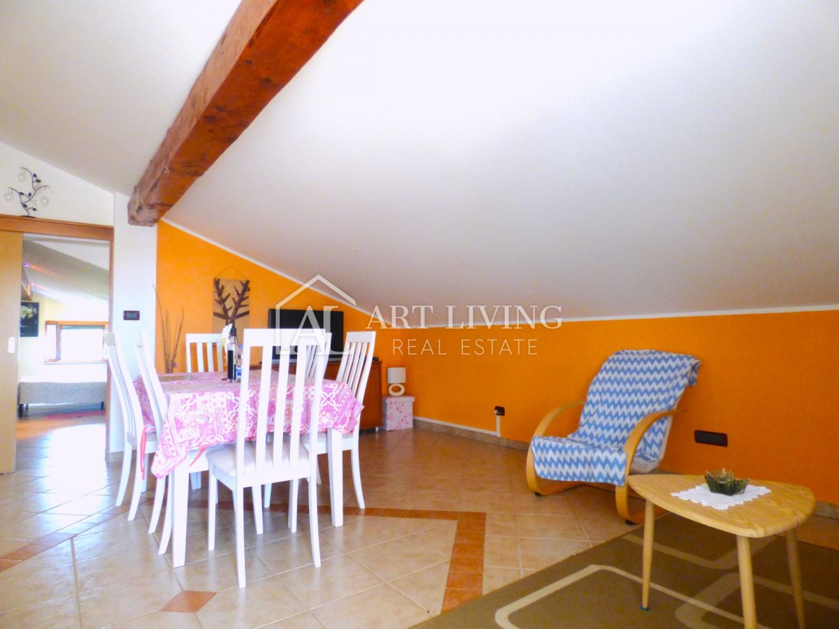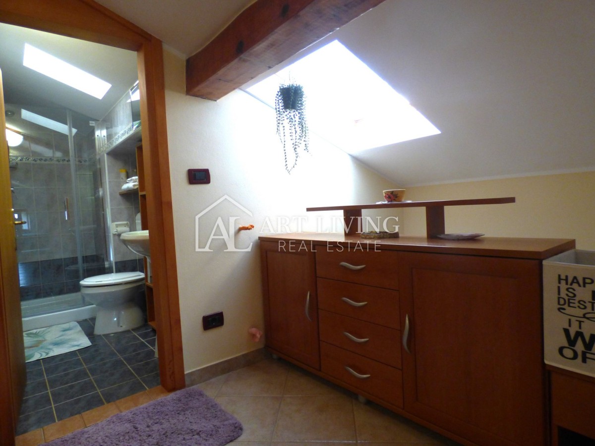 Alla mansarda si accede da ingresso separato con scala ed è composta da un appartamento completamente arredato con soggiorno open space, cucina e sala da pranzo, due camere da letto e un bagno. La cucina e il soggiorno conducono direttamente al terrazzo coperto con vista.