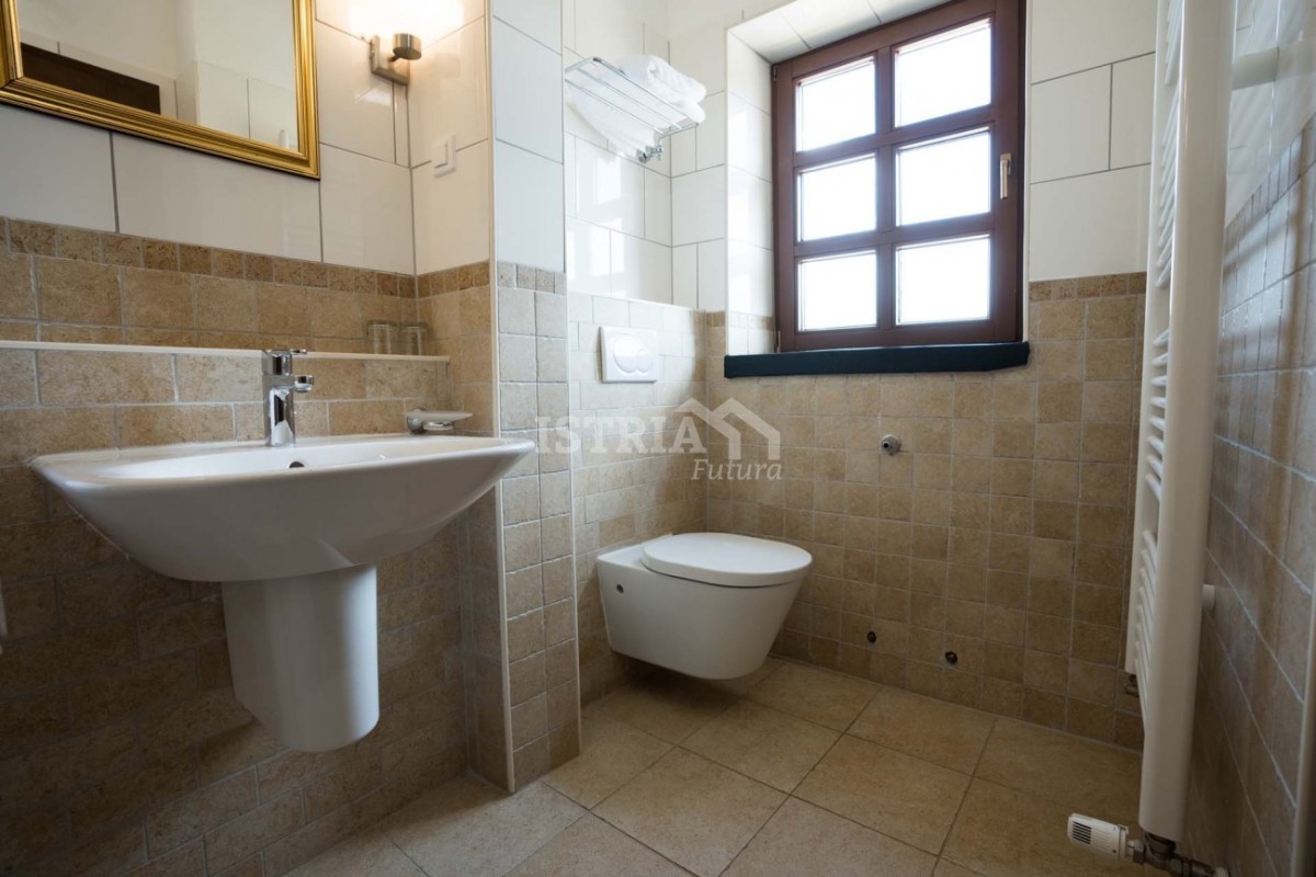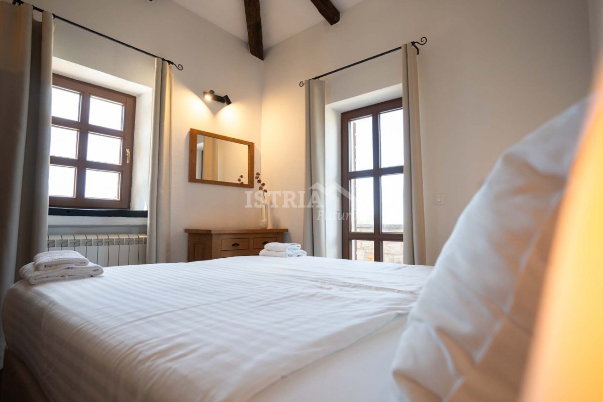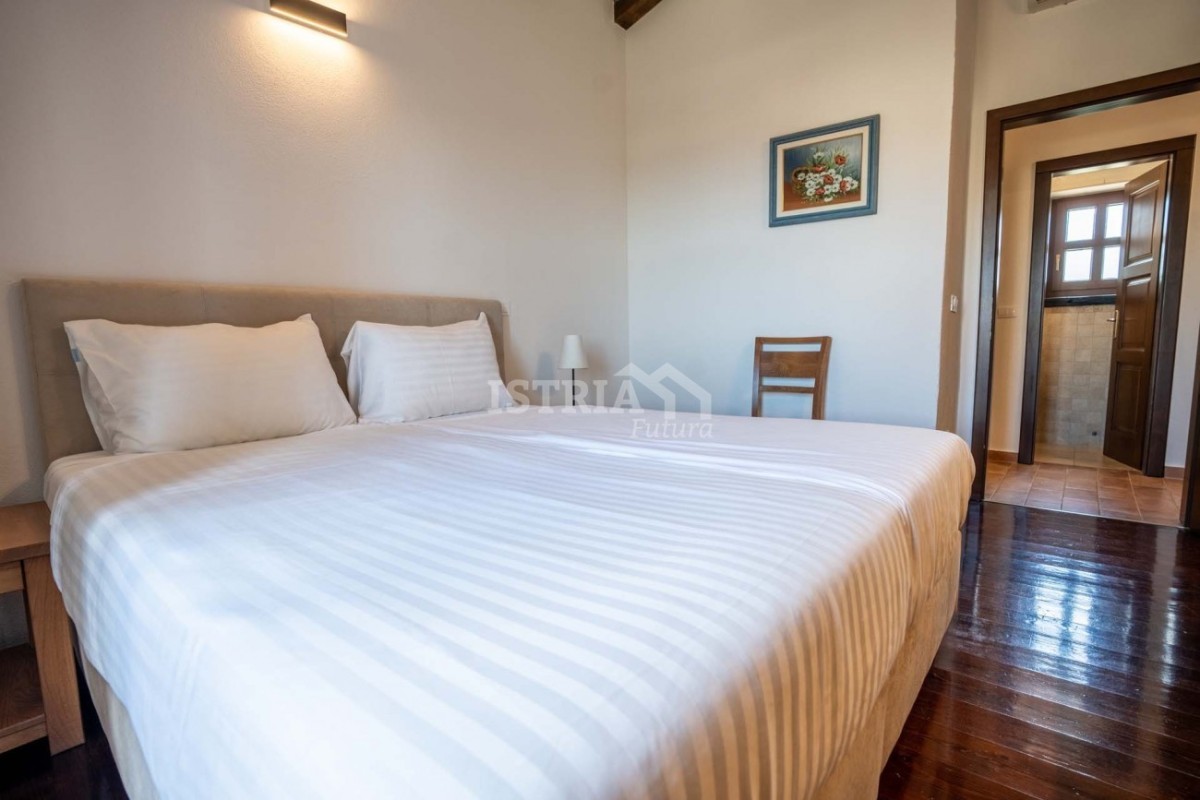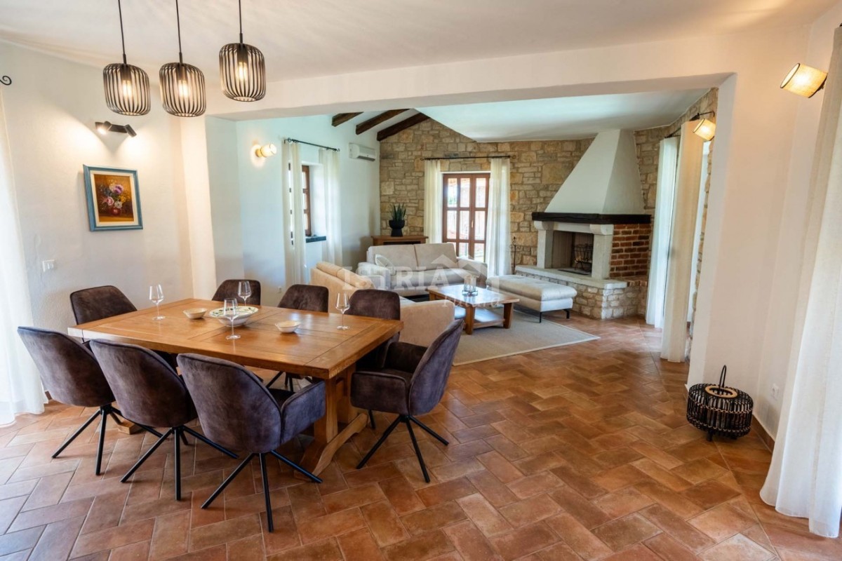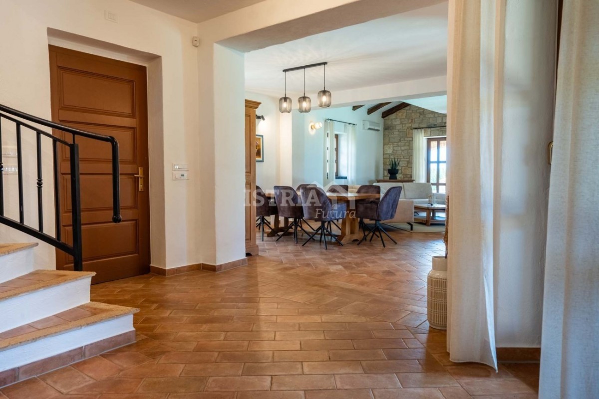 In vendita, una splendida villa in pietra con una superficie di 257 m² distribuiti tra piano terra e primo piano, situata su un terreno recintato e curato di 1.735 m², a 2,5 km da San Lorenzo, 10 km da Leme (mare) e 15 km da Parenzo.