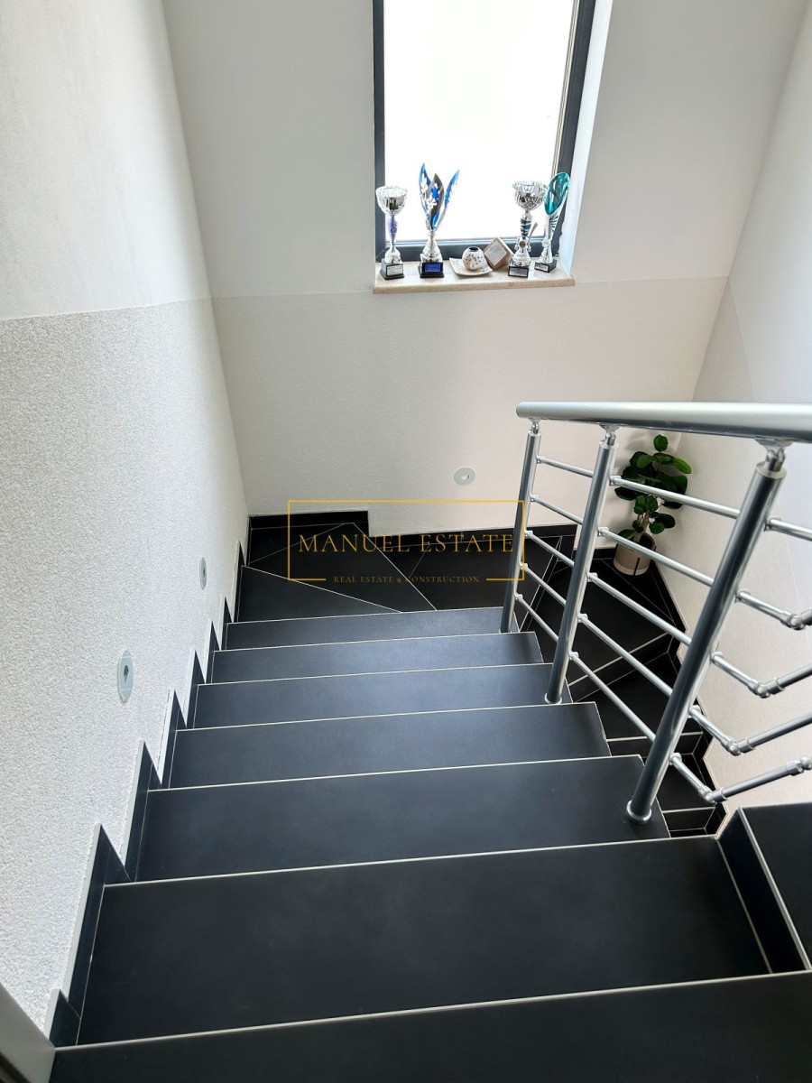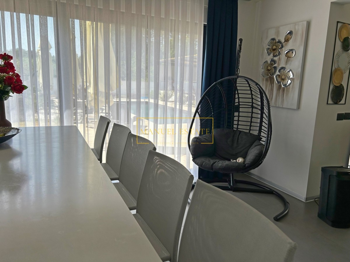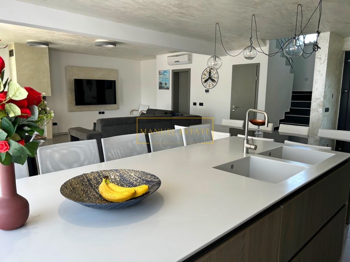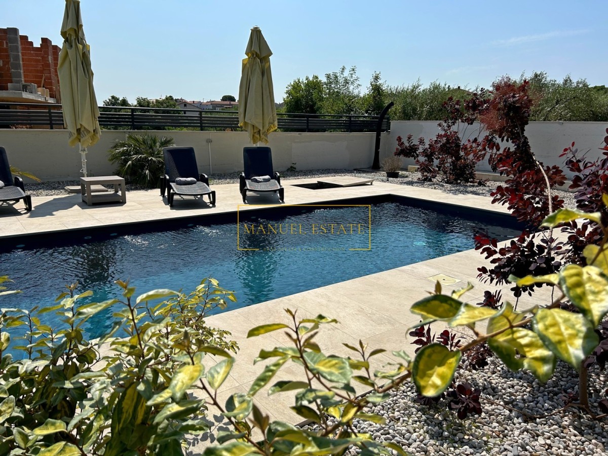 Una villa moderna in una zona tranquilla, situata nelle vicinanze di Parenzo, vicino a S. Lovreča, ha una splendida vista sul mare, superficie abitabile totale di 210 m2 con giardino di 768 m2. Si sviluppa su due piani; piano terra e primo piano. Al piano terra si trova una camera da letto con bagno en-suite, bagno, toilette, ripostiglio, lavanderia e un'ampia zona giorno open space, composta da cucina completamente attrezzata, sala da pranzo e soggiorno con camino, vetrate murate e accesso ad un ampio terrazzo con vista sulla piscina e zona prendisole. Al primo piano ci sono tre camere da letto modernamente attrezzate con bagno annesso. Tutte e tre le camere hanno accesso al terrazzo. In una delle camere è presente anche una sauna per due persone, mentre sulla terrazza della seconda camera è presente una vasca idromassaggio, che offre una vista sulla piscina e sulla natura. Il riscaldamento a pavimento tramite pannelli solari è stato installato in tutta la casa e in ogni stanza sono installati anche condizionatori d'aria di alta qualità. Nel giardino meticolosamente curato e ricco di verde, si trova una piscina con una superficie di 11x5 mq, che ha la possibilità di riscaldare l'acqua, poi una zona prendisole con doccia esterna, una zona lounge per il relax, una terrazza coperta e una zona grill. Ci sono due posti auto nel cortile. Il mare e il Canale di Leme distano 2 km, Parenzo 12 km e l'aeroporto di Pola 38 km. Il prezzo di questa moderna villa è di 750.000 euro. Per la sua posizione è perfetto per creare la tua nuova casa o come buona opportunità e investimento, e come ulteriore rendita da locazione turistica. Per tutte le altre informazioni, contattateci.
