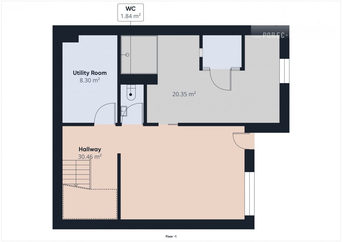 Il piano seminterrato è composto dall'ampio open space con la palestra, i servizi benessere con la sauna e la doccia, il bagno e il locale tecnico. La scala interna in pietra istriana conduce al piano terra. Questo livello contiene l'ingresso, il bagno, la cucina con la isola mobile, la zona pranzo, il soggiorno a pianta aperta e la camera da letto con il bagno privato.