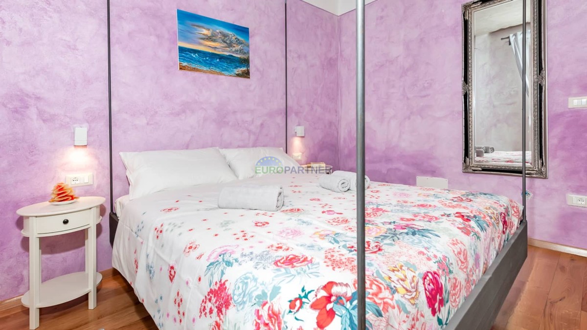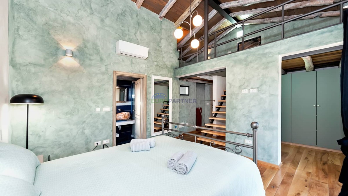 Al piano superiore ci sono due camere da letto con bagno privato e terrazzi. Una camera ha anche un soppalco dove possono essere sistemati letti aggiuntivi. Al primo piano, sopra il soggiorno, si trova una rete porta pesi fino a 700 kg, che rende speciale l'intero interno.