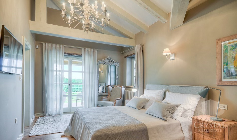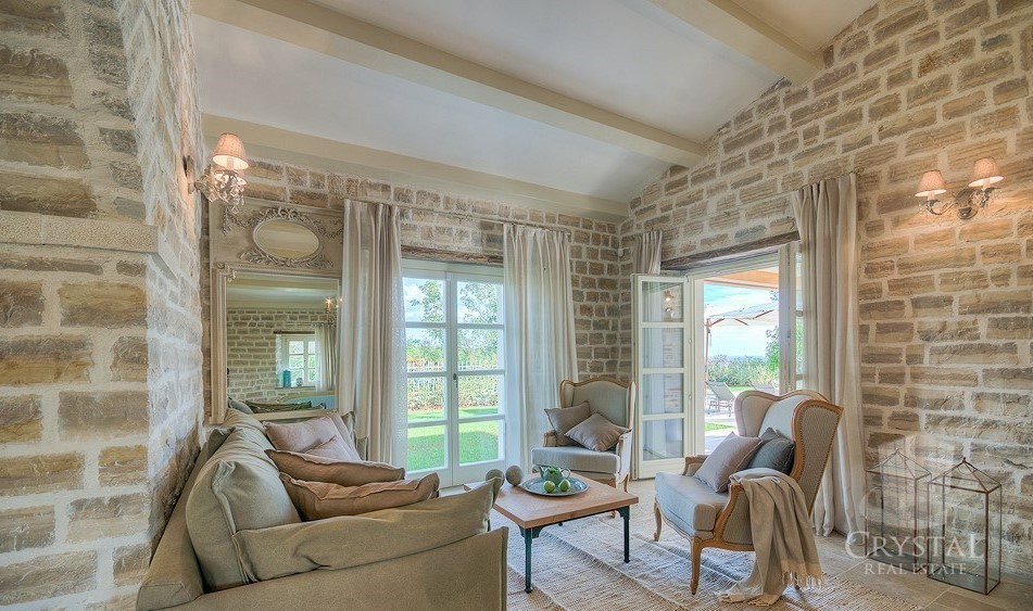 La villa è lussuosamente arredata con mobili rustici di lusso, mentre i balconi al 1° pano offrono una splendida vista panoramica sul mare.