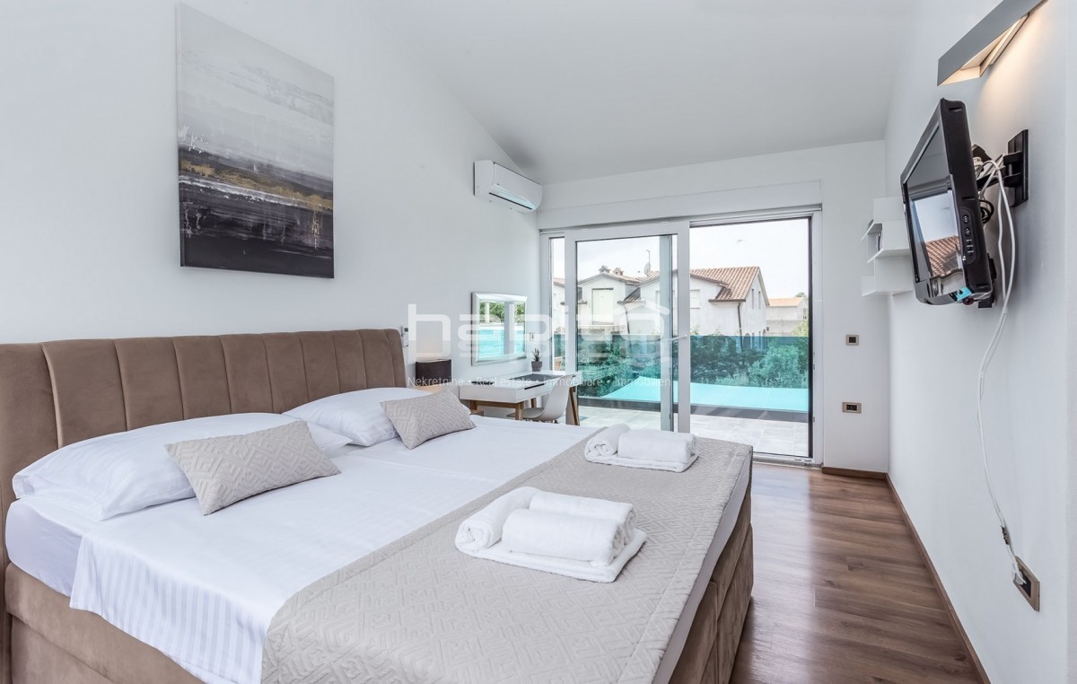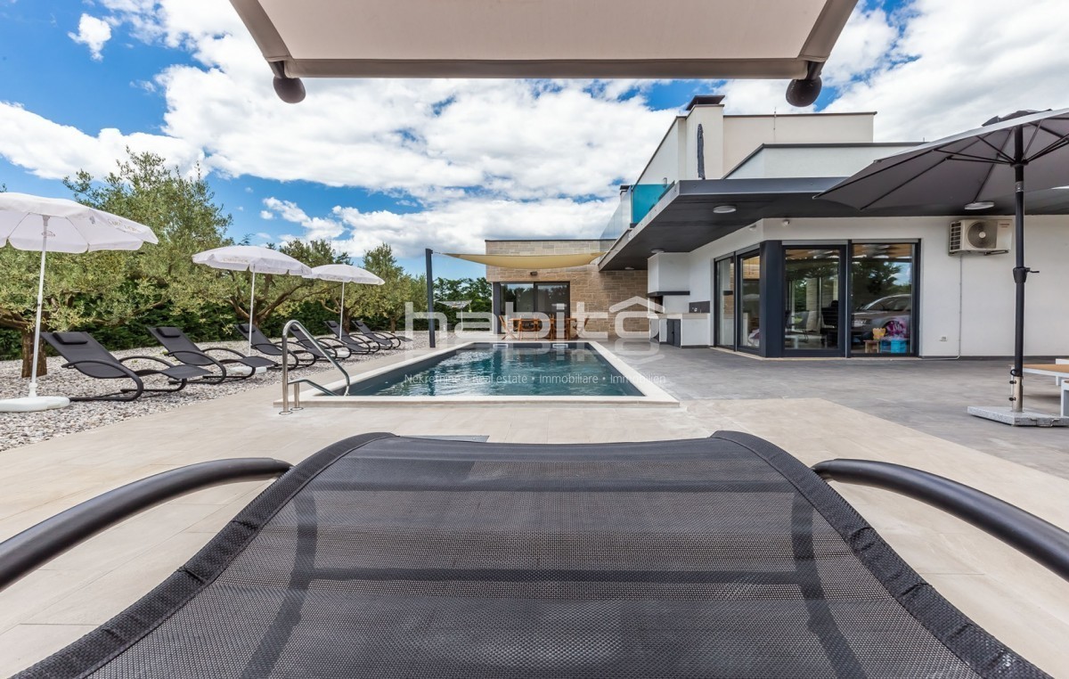 Nel seminterrato della casa ce un bagno, lavanderia, una taverna con un grande camino e una finestra, una lavanderia e una spaziosa stanza che è prevista per la palestra. Scale di legno di quercia portano al piano terra della casa che contiene un soggiorno con camino, sala da pranzo, bella cucina dal design moderno, due camere da letto e due bagni. Da ogni stanza attraverso grandi aperture di vetro si può andare al giardino e piscina della casa, ma si può anche godere della splendida vista della natura e del campanile del villaggio Visignano. Il primo piano della casa offre altre due camere da letto, un bagno e una splendida terrazza con vista aperta sulla terra arabile, villaggio di Visignano e in lontananza anche sul mare.