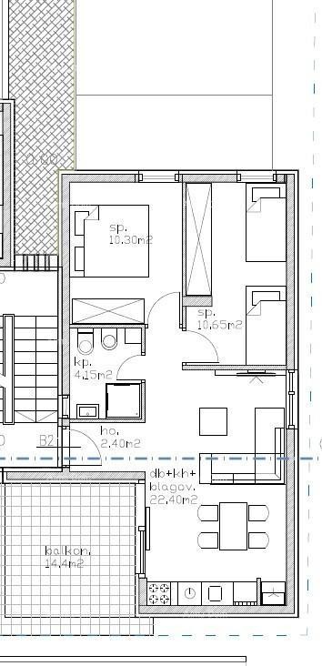 In villa B bevindt zich een appartement met een totale oppervlakte van 72,13 m², gelegen op de 1e verdieping van het gebouw. Het appartement heeft een binnenoppervlakte van 49,90 m² en bestaat uit een entreehal, keuken, woonkamer en eetkamer met toegang tot het terras, twee slaapkamers en een badkamer.