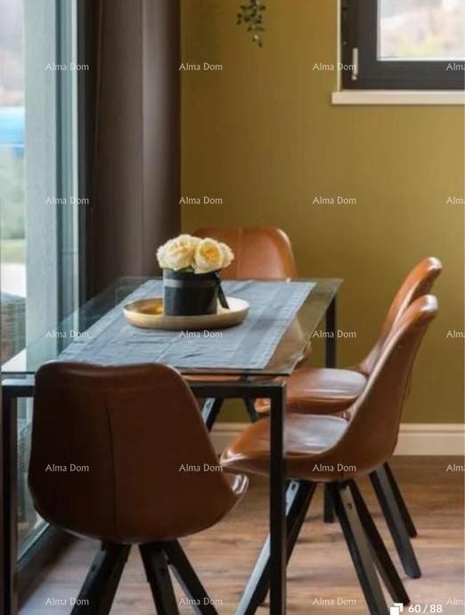 Te koop: moderne appartement op de eerste (laatste) verdieping van een gebouw, gelegen in een rustige omgeving, op slechts 10 minuten rijden (ongeveer 7 km) van het centrum van Poreč. Het appartement bestaat uit een keuken, eetkamer en woonkamer met toegang tot een terras (4,14 m²), en twee slaapkamers. Het is uitgerust met airconditioning en vloerverwarming in de badkamer.