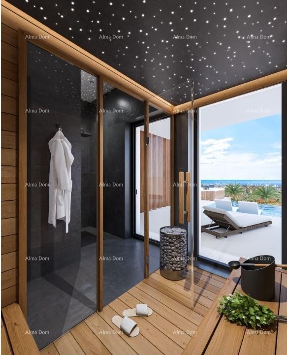Het overloopzwembad is het centrum van deze moderne villa en creëert de illusie dat het water samenvloeit met de lucht of de zee in de verte. Eén van de wanden van het zwembad is gemaakt van transparant glas, wat een uniek visueel effect creëert. Naast het zwembad zelf, alleen gescheiden door transparant glas, bevindt zich een vuurplaats, nog een betoverende toevoeging die de sfeer van de villa compleet maakt. De vuurplaats, gelegen op het niveau van het zwembad, zorgt voor warmte en een romantische sfeer en creëert de perfecte plek om te socialiseren en te ontspannen. 's Avonds weerkaatst de vlamflits op de glazen wand van het zwembad, waardoor een betoverend lichtspel ontstaat. Voor een complete ervaring krijgen toekomstige eigenaren de mogelijkheid om te ontspannen in een elegante sauna met sterrenhemel of te genieten van de bedwelmende ervaring van een buitenjacuzzi.