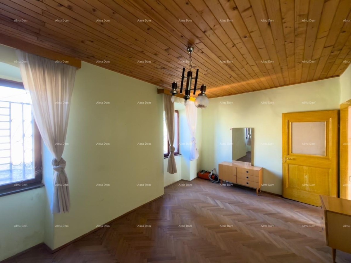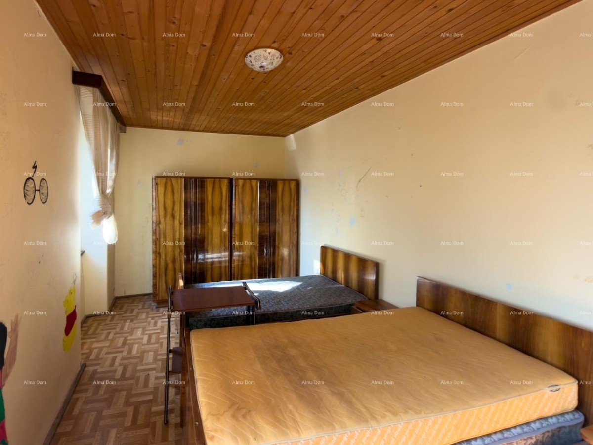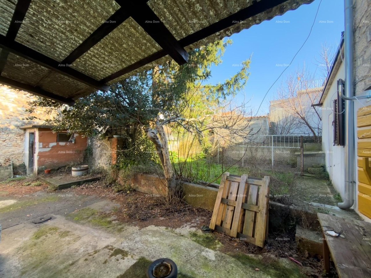 Het huis bevindt zich op een rustige locatie met uitzicht op het park aan de ene kant en de toren van de Vodnjan-kerk aan de andere kant. De begane grond bestaat uit een eetkamer, keuken, badkamer en woonkamer, van waaruit je naar de tuin kunt gaan. Op de begane grond is er ook een garage die direct toegang biedt tot het huis en een uitgang naar de tuin heeft. De eerste en tweede verdieping hebben elk twee slaapkamers, en op de derde verdieping is er een zolder. Het dak is tien jaar geleden vervangen. De rest van het huis heeft renovatie nodig.