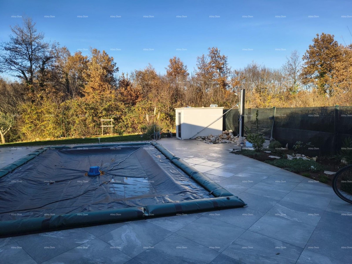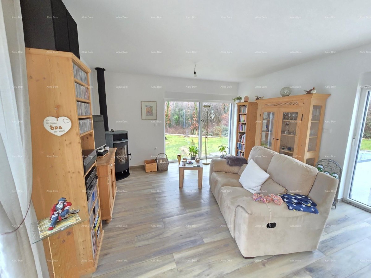 Te koop is een vrijstaande bungalow met zwembad, bestaande uit een inkomhal, een grote slaapkamer met badkamer, twee kleinere slaapkamers die een badkamer delen, een toilet, een keuken met eetkamer en een woonkamer. Vanuit de woonkamer is er toegang tot twee grote terrassen en een zwembad van 20 m². De woonkamer is licht en luchtig met grote glazen oppervlakken.