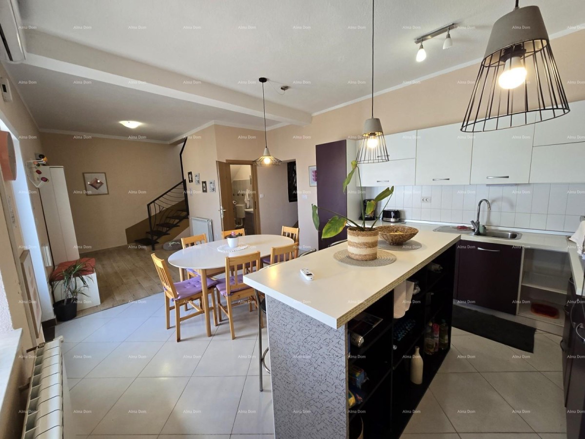 Interne trappen leiden naar de tussenverdieping van het huis, waar zich een ruime woonkamer bevindt met een terras van ongeveer 8 m². Via nog een interne trap gaat men naar de eerste verdieping van het huis, waar zich twee slaapkamers en een badkamer bevinden.