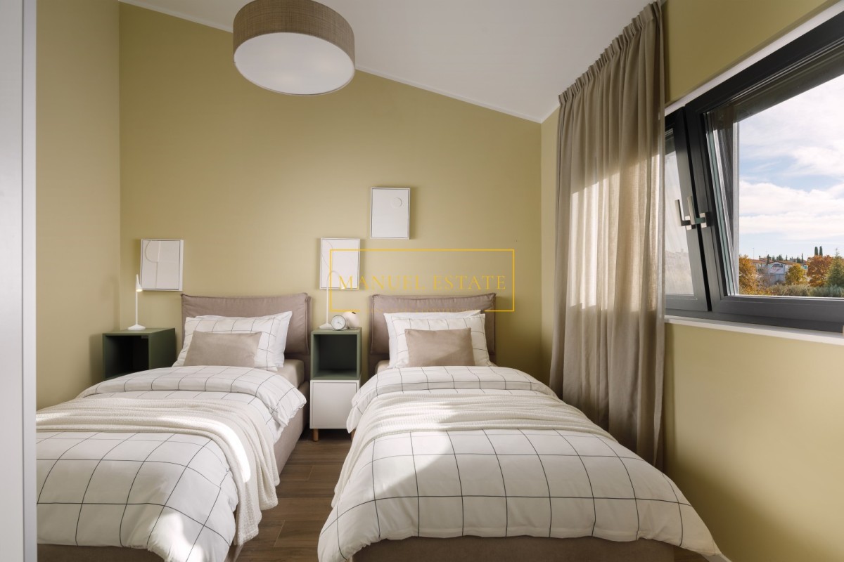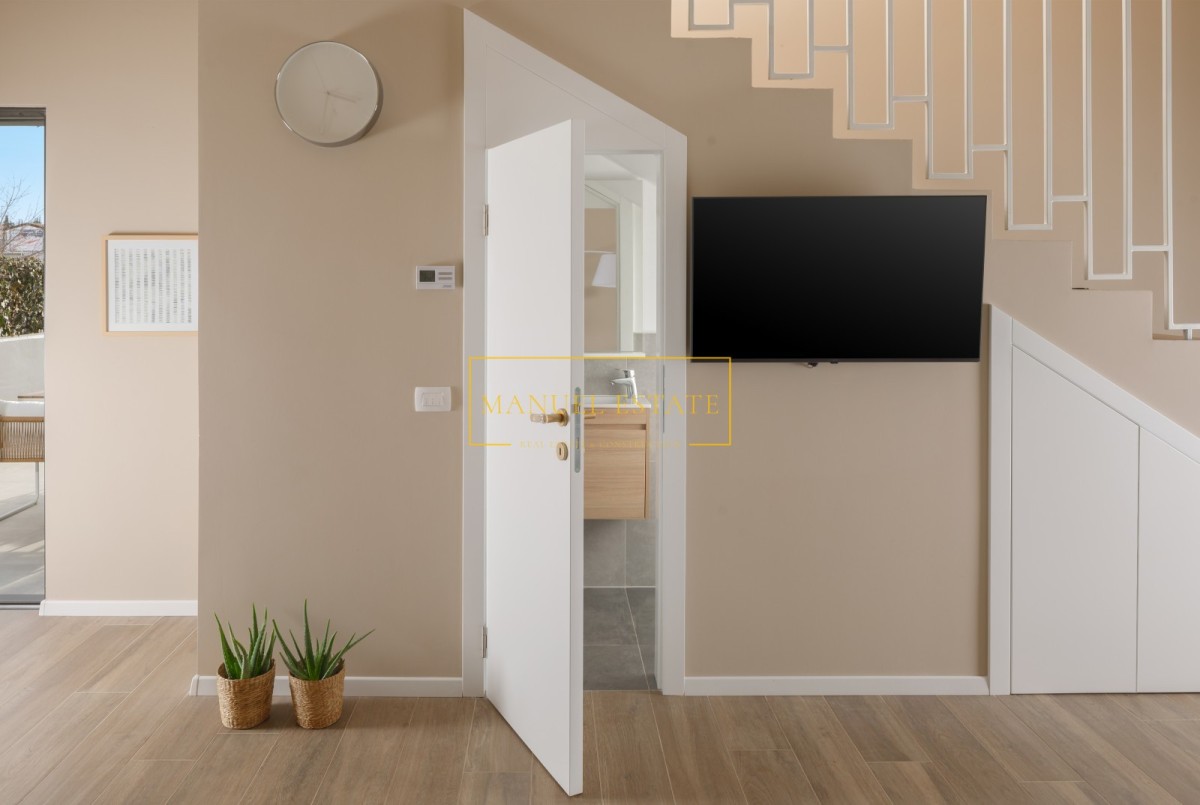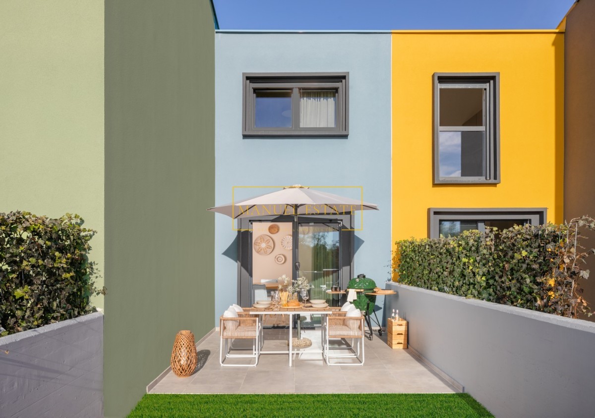 Moderne tussenwoning (B4), nabij Poreč, totale woonoppervlakte 76,27 m2. Het is verdeeld over twee verdiepingen, begane grond en eerste verdieping. Op de begane grond is er een keuken + eetkamer met toegang tot de tuin, een toilet, een trap en een berging, en een woonkamer met toegang tot het terras en de tuin. Op de tweede verdieping is er: een trap, een gang, twee slaapkamers en een badkamer. De verwarming en koeling van de kamers gebeurt met behulp van airconditioners van topkwaliteit. Het buitenste gedeelte bestaat uit een zorgvuldig aangelegde tuin van 108,40 m2. Er is één parkeerplaats in de tuin. Het wooncomplex van in totaal 10 rijtjeshuizen ligt vlakbij de zee en op slechts 4,7 km van het historische centrum van Poreč. De prijs van dit huis in een rij van modern design is 380.000 euro (BTW en makelaarscourtage inbegrepen in de prijs). Volledig uitgerust met meubels en apparatuur te huur, met indeling voor het aanbieden van toeristische accommodatiediensten. Voor alle overige informatie kunt u gerust contact met ons opnemen.