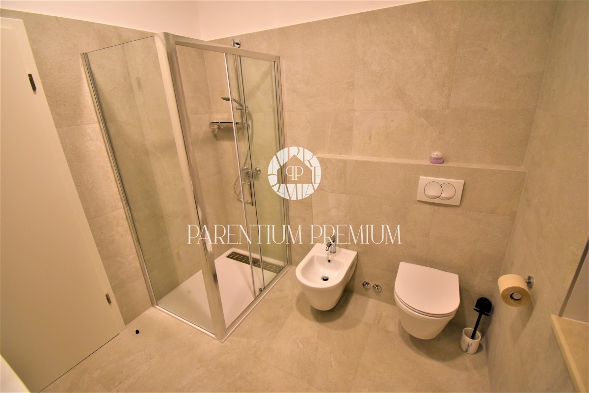 Eleganca in kakovost določata vsako podrobnost tega stanovanja. Italijanska keramika "Marca Corona", PVC stavbno pohištvo in aluminijasta polkna ter vključeno pohištvo omogočajo vselitev tega doma.