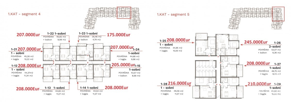 Spodaj si lahko ogledate slike objekta skupaj s tlorisi, ki poudarjajo posamezne cene posameznih stanovanj.