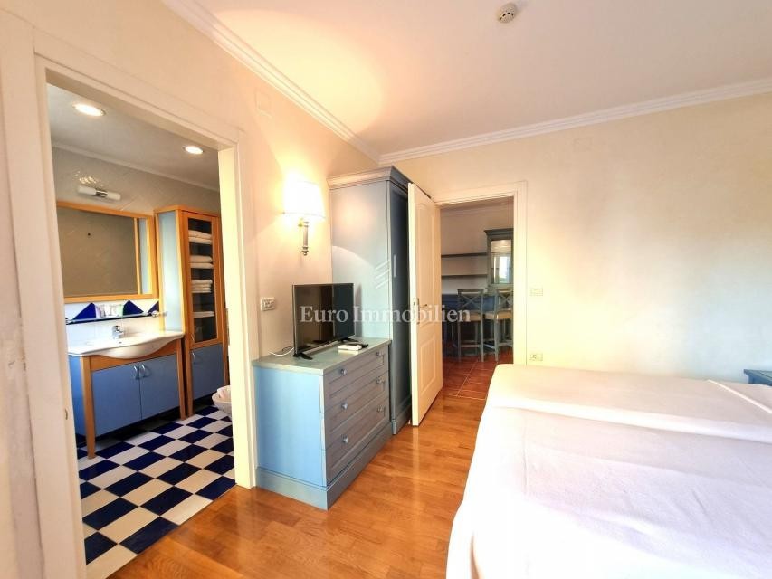 EKSKLUZIVNA IN REDKA LOKACIJA V ISTRI!!! Čudovit apartma se nahaja le 130 m od morja, v dobro vzdrževanem delu naselja. Objekt je bil zgrajen leta 2005 in je redno vzdrževan. Nahaja se v visokem pritličju stavbe z dvigalom. Obsega: shrambo v kleti 5,15 m2, stanovanje v pritličju, ki ga sestavljajo: hodnik 8,43 m2, kopalnica 7,45 m2, spalnica 10,78 m2, spalnica 18,44 m2, kopalnica 5,15 m2, dnevna soba in kuhinja 35,51 m2, nadkrita terasa 25,06 m2, skupaj 115,97 m2. Možen je nakup parkirnega mesta za doplačilo 14.000 evrov ali garažnega mesta za doplačilo 20.000 evrov. Stanovanje se prodaja v celoti opremljeno kot na slikah. Ogrevanje/hlajenje je urejeno s klimatsko napravo. Lastnikom stanovanj je na voljo možnost uporabe bazena, fitnesa, z določenimi popusti pa tudi notranjega bazena, golfa ipd. Glede na lokacijo in vsebino je idealna izbira kot naložba za turistični najem, pa tudi za celoletno/začasno bivanje v Istri.