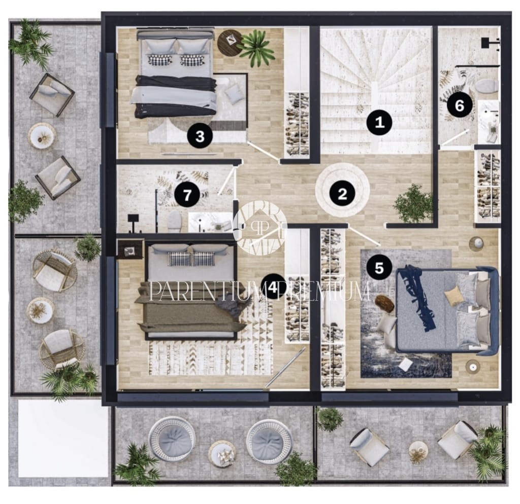 V prvem nadstropju so 3 spalnice, od katerih ima vsaka svojo teraso, 1 spalnica ima svojo kopalnico in še ena skupna kopalnica za drugi 2 spalnici.